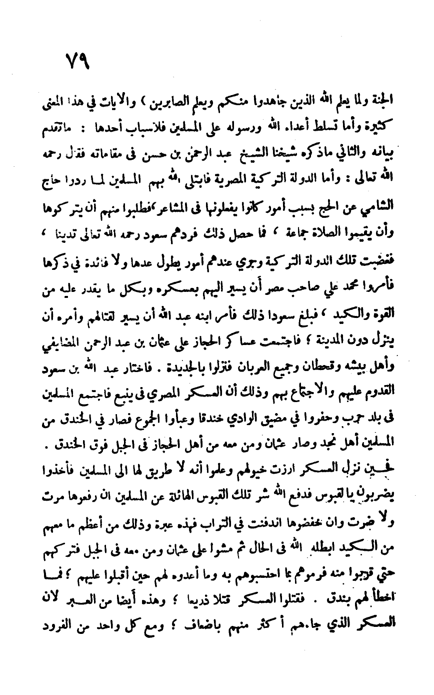 الْجَنَّةَ وَلَمَّا يَعْلَمِ اللَّهُ الَّذِينَ جَاهَدُوا مِنْكُمْ وَيَعْلَمَ الصَّابِرِينَ} والآيات في هذا المعنى كثيرة وأما تسلط أعداء الله ورسوله على المسلمين فلأسباب أحدها: ما تقدم بيانه والثاني ما ذكره شيخنا الشيخ عبد الرحمن بن حسن في مقاماته فقال –رحمه الله تعالى-: وأما الدولة التركية المصرية فابتلى الله بهم المسلمين لما ردوا حاج الشامي عن الحج بسبب أمور كانوا يفعلونها في المشاعر، فطلبوا منهم أن يتركوها وأن يقيموا الصلاة جماعة، فما حصل ذلك فردهم سعود –رحمه الله تعالى تديناً فغضبت تلك الدول التركية وجرى عندهم أمور يطول عدها ولا فائدة في ذكرها فأمروا محمد علي صاحب مصر أن يسير إليهم بعسكره وبكل ما يقدر عليه من القوة والكيد، فبلغ سعوداً ذلك فأمر ابنه عبد الله أن يسير لقتالهم وأمرهم أن ينزل دون المدينة؛ فاجتمعت عساكر الحجاز على عثمان بن عبد الرحمن المضايفي وأهل بيشة وقحطان وجميع العربان فنزلوا بالجديدة. فاختار عبد الله بن سعود القدوم عليهم والاجتماع بهم وذلك أن العسكر المصري في ينبع فاجتمع المسلمين في بلد حرب وحفروا في مضيق الوادي خندقاً وعبأوا الجموع فصار في الخندق من المسلمين أهل نجد وصار عثمان ومن معه من أهل الحجاز في الجبل فوق الخندق فحين نزل العسكر أرزت خيولهم وعلموا أنه لا طريق لها إلى المسلمين فأخذوا يضربون بالقبوس فدفع الله شر تلك القبوس الهائلة عن المسلمين أن رفعوها مرت ولا ضرت وأن خفضوها اندفنت في التراب فهذه عبرة وذلك من أعظم ما معهم من الكيد أبطله الله في الحال ثم مشوا على عثمان ومن معه في الجبل فتركهم حتى قربوا منه فرموهم بما احتسبوهم به وما أعدوه لهم حين أقبلوا عليهم؛ فما أخطأ لهم بندق.؟ فقتلوا العسكر قتلاً ذريعاً؛ وهذه أيضاً من العبر لأن العسكر الذين جاءهم أكثر منهم بأضعاف؛ ومع كل واحد من الفرود