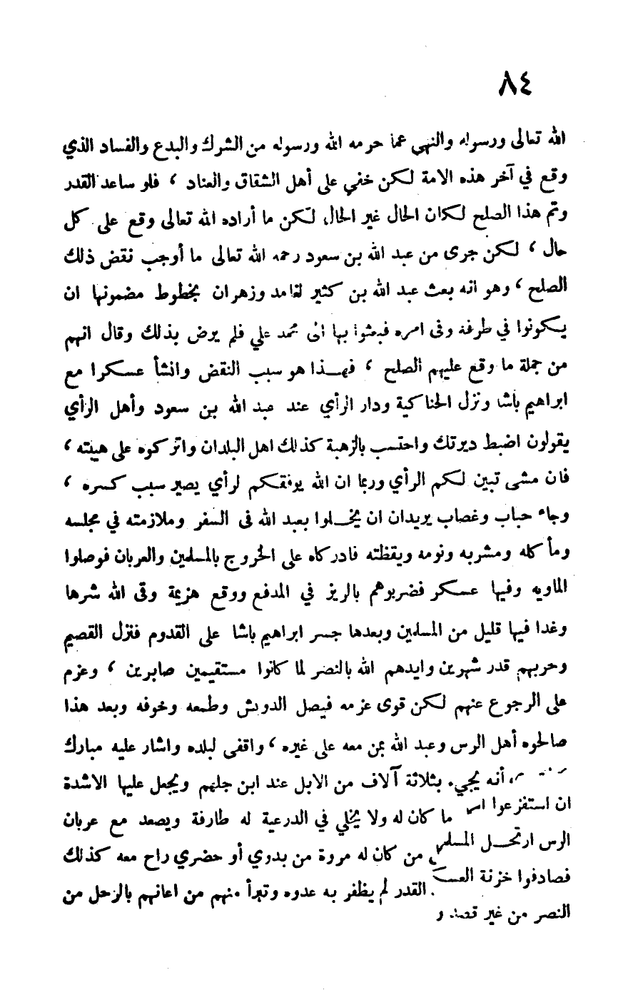 الله تعالى ورسوله والنهي عما حرمه الله ورسوله من الشرك والبدع والفساد الذي وقع في آخر هذه الأمة لكن خفي على أهل الشقاق والعناد، فلو ساعد القدر وتم هذا الصلح لكان الحال غير الحال لكن ما أراده الله تعالى وقع على كل حال، لكن جرى من عبد الله بن سعود –رحمه الله تعالى- ما أوجب نقض ذلك الصلح، وهو أنه بعث عبد الله بن كثير لغامد وزهران بخطوط مضمونها أن يكونوا في طرفه وفي أمره فبعثوا بها إلى محمد علي فلم يرض بذلك وقال إنهم من جملة ما وقع عليهم الصلح، فهذا هو سبب النقض وأنشأ عسكراً إبراهيم باشا ونزل الحناكية ودار الرأي عند عبد الله بن سعود وأهل الرأي يقولون اضبط ديرتك واحتسب بالرهبة كذلك كذلك أهل البلدان واتركوه على هيئته، فإن مشى تبين لكم الرأي وربما أن الله يوفقكم لرأي يصير سبب كسره، وجاء حباب وغصاب يريدان أن يخلوا بعبد الله في السفر وملازمته في مجلسه ومأكله ومشربه ونومه ويقظته فأدركاه على الخروج بالمسلمين والعربان فوصلوا المادية وفيها عسكر فضربوهم بالريز في المدفع ووقع هزيمة وقى الله شرها وغدا فيها قليل من المسلمين وبعدها جسر إبراهيم باشا على القدوم فنزل القصيم وحربهم قدر شهرين وأيدهم الله بالنصر لما كانوا مستقيمين صابرين، وعزم على الرجوع عنهم لكن قوى عزمه فيصل الدويش وطعمه وخوفه وبعد هذا صالحوه أهل الرس وعبد الله بمن معه على غيره، وأقفى لبلده وأشار عليه مبارك؟ أنه يجئ بثلاثة آلاف من الإبل عند ابن جلهم ويجعل عليها الأشدة إن استفزعوا أمر ما كان له ولا يخلي في الدرعية له طارفة ويصعد مع عربان الرس ارتحل المسلم من كان مروة من بدوي أو حضري راح معه كذلك فصادفوا خزنة العسكر القدر لم يظفر به عدوه وتبرأ منهم من أعانهم بالرحل من النصر من غير قصد