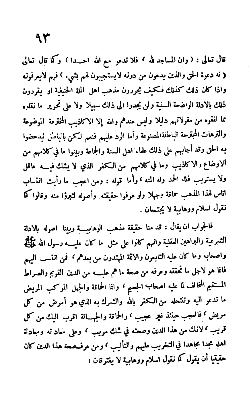 قال تعالى: {وَأَنَّ الْمَسَاجِدَ لِلَّهِ فَلا تَدْعُو مَعَ اللَّهِ أَحَداً} وكما قال تعالى: {لَهُ دَعْوَةُ الْحَقِّ وَالَّذِينَ يَدْعُونَ مِنْ دُونِهِ لا يَسْتَجِيبُونَ لَهُمْ بِشَيْءٍ} فهم لا يعرفونه وإذا كان ذلك كذلك فكيف يحررون مذهب أهل الملة الحنيفية أو يقررون ذلك بالأدلة الواضحة السنية ولن يجدوا إلى ذلك سبيلاً ولا على تحرير ما نقلوه مما لفقوه من مقولاتهم دليلاً وليس عندهم والله إلا الأكاذيب المخترعة الموضوعة والترهات المجترحة الباطلة المصنوعة وأما الرد عليهم فنعم لكن بالباطل ليدحضوا به الحق وقد أجابهم على ذلك علماء أهل السنة والجماعة وبينوا ما في كلامهم من الأوضاع والأكاذيب وما في كلامهم من الكفر الذي لا يشك فيه عاقل ولا يستريب فلله الحمد وله المنة، وأما قوله: ومن أعجب ما رأيت انتساب أناس لهذا المذهب حماقة وجهلاً ولو عرفوا حقيقته وأصوله لتبرأوا منه وقالوا كما نقول إسلام ووهابية لا يجتمعان.