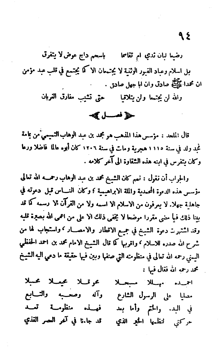 والجواب أن نقول: نعم كان الشيخ محمد بن عبد الوهاب –رحمه الله- مؤسس هذه الدعوة المحمدية والملة الإبراهيمية؛ وكان الناس قبل دعوته في جهالية جهلاء لا يعرفون من الإسلام إلا اسمه ولا من القرآن إلا رسمه كما قد بينا ذلك فيما مضى مقرراً موضحاً لا يخفى ذلك إلا على من أعمى الله بصيرة قلبه، وقد اشتهرت دعوة الشيخ في جميع الأقطار والأمصار، واستجاب له من شرح الله صدره للإسلام، وأقربها كما قال الشيخ الإمام محمد بن أحمد الحفظي اليمني –رحمه الله تعالى- في منظومته التي صنفها وبين فيها حقيقة ما دعا إليه الشيخ محمد –رحمه الله- فقال فيها: