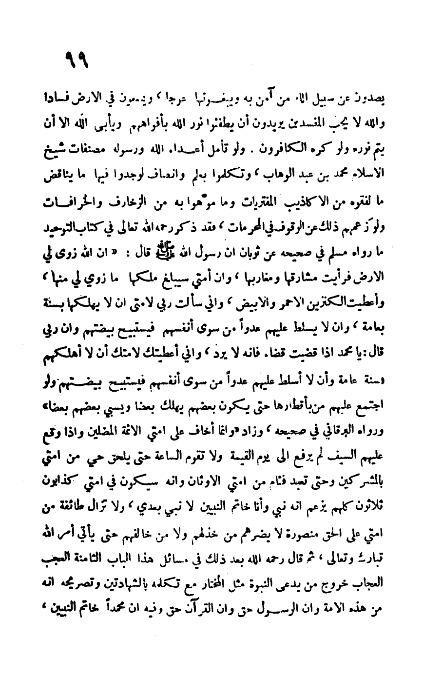 يصدون عن سبيل الله من آمن به ويبغونها عوجاً ويسعون في الأرض فساد والله لا يحب المفسدين يريدون أن يطفئوا نور الله بأفواههم ويأبى الله إلا أن يتم نوره ولو كره الكافر ون. ولو تأمل أعداء الله ورسوله مصنفات شيخ الإسلام محمد بن عبد الوهاب، وتكلموا بعلم وإنصاف لوجدوا فيه ما نياقض ما لفقوه من الأكاذيب والمفتريات وما موهوا به من الزخارف والخرافات ولو زعمهم ذلك من الوقوف في المحرمات، فقد ذكر –رحمه الله تعالى- في كتاب التوحيد ما رواه مسلم في صحيحه عن ثوبان أن رسول الله –صلى الله عليه وسلم- قال: "إن الله زوى لي الأرض فرأيت مشارقها ومغاربها، وأن أمتي سيبلغ ملكها ما زوي لي منها، وأعطيت الكنزين الأحمر والأبيض، وإني سألت ربي لأمتي أن لا يهلكها بسنة بعامة، وأن الله لا يسلط عليهم عدواً من سوى أنفسهم فيستبيح بيضتهم وإن ربي قال يا محمد إذا قضيت قضاء فإنه لا يرد، وإني أعطيتك لأمتك أن لا أهلكتهم بسنة عامة وأن أسلط عليهم عدواً من سوى أنفسهم فيستبيح بيضتهم ولو اجتمع عليهم من بأقطارها حتى يكون بعضهم يهلك بعضاً ويسبي بعضهم بعضاً" رواه البرقاني في صحيحة، وزاد "وإنما أخاف على أمتي الأئمة المضلين وإذا وقع عليهم السيف لم يرفع على يوم القيامة ولا تقوم الساعة حتى يلحق حي من أمتي بالمشركين وحتى تعبد فئام من أمتي الأوثان وإنه سيكون في أمتي كذابون ثلاثون كلهم يزعم أنه نبي وأنا خاتم النبيين لا نبي بعد، ولا تزال طائفة من أمتي على الحق منصورة لا يضرهم من خذلهم ولا من خالفهم حتى يأتي أمر الله تبارك وتعالى"، ثم قال –رحمه الله- بعد ذلك في مسائل هذا الباب الثامنة العجب العجاب خروج من يدعي النبوة مثل المختار مع تكلمه بالشهادتين وتصريحه أنه من هذه الأمة وأن الرسول حق وأن القرآن حق وفيه أن محمداً خاتم النبيين،