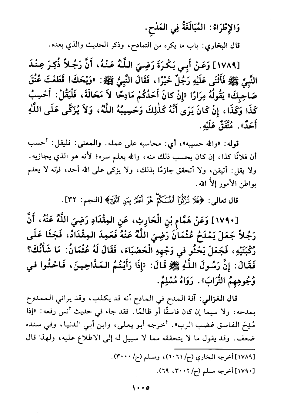 وَاليَعَاسِيبُ» : ذُكُورُ النَّحْلِ. «وَجِزْلَتَيْنِ» : أيْ قِطْعَتَيْنِ، «وَالغَرَضُ» : الهَدَفُ الَّذي يُرْمَى إلَيْهِ بالنَّشَّابِ، أيْ: يَرْمِيهِ رَمْيَةً كَرَمْيَةِ النَّشَّابِ إلى الهَدَفِ. «وَالمَهْرُودَةُ» بالدال المهملة والمعجمة، وهي: الثَّوْبُ المَصْبُوغُ. قَولُهُ: «لا يَدَانِ» : أيْ لا طَاقَةَ. «وَالنَّغَفُ» : دُودٌ. «وَفَرْسَى» : جَمْعُ فَرِيسٍ، وَهُوَ القَتِيلُ. وَ «الزَّلَقَةُ» : بفتح الزاي واللام وبالقاف، ... وَرُوي: الزُّلْفَةُ بضم الزاي وإسكان اللام وبالفاء وهي المِرْآةُ. ... «وَالعِصَابَةُ» : الجَمَاعَةُ. «وَالرِّسْلُ» بكسرِ الراء: اللَّبَنُ. «وَاللِّقْحَةُ» : اللَّبُونُ. «وَالفِئَامُ» بكسر الفاء وبعدها همزة ممدودة: الجماعةُ. ... «وَالفَخِذُ» مِنَ النَّاسِ: دُونَ القَبِيلَة.