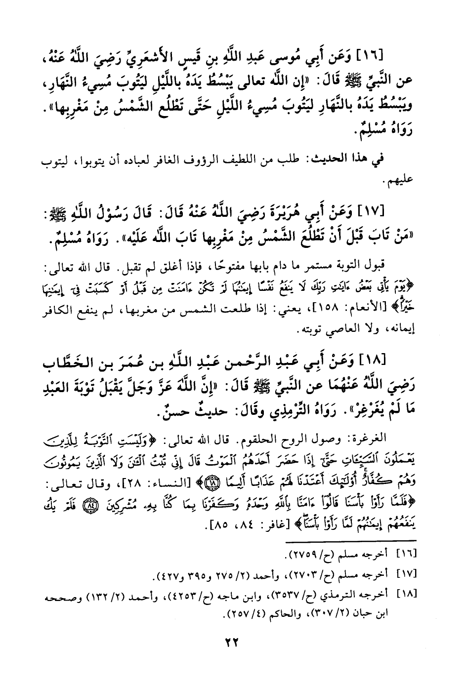 [41] وعن أبي عبد الله خَبَّاب بنِ الأَرتِّ - رضي الله عنه - قَالَ: شَكَوْنَا إِلَى ... رسولِ الله - صلى الله عليه وسلم - وَهُوَ متَوَسِّدٌ بُرْدَةً لَهُ في ظلِّ الكَعْبَةِ، فقُلْنَا: أَلا تَسْتَنْصِرُ لَنَا ألا تَدْعُو لَنا؟ فَقَالَ: «قَدْ كَانَ مَنْ قَبْلَكُمْ يُؤْخَذُ الرَّجُلُ فَيُحْفَرُ لَهُ في الأرضِ فَيُجْعَلُ فِيهَا، ثُمَّ يُؤْتَى بِالمِنْشَارِ فَيُوضَعُ عَلَى رَأسِهِ فَيُجْعَلُ