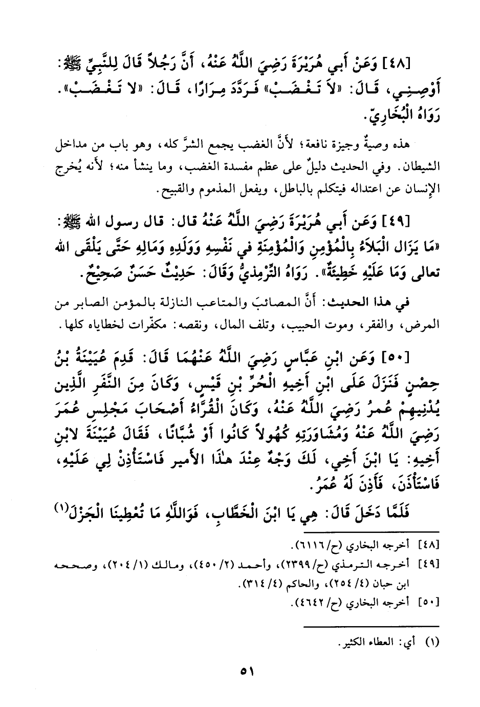 [78] الخامس: عن جابر - رضي الله عنه -: أَنَّهُ غَزَا مَعَ النبي - صلى الله عليه وسلم - قِبلَ نَجْدٍ، فَلَمَّا قَفَلَ رَسُول الله - صلى الله عليه وسلم - قَفَلَ معَهُمْ، فَأَدْرَكَتْهُمُ القَائِلَةُ في وَادٍ كثير العِضَاه، فَنَزَلَ رَسُول الله - صلى الله عليه وسلم - وَتَفَرَّقَ النَّاسُ يَسْتَظِلُّونَ بالشَّجَرِ، وَنَزَلَ رَسُول الله - صلى الله عليه وسلم - تَحتَ سَمُرَة فَعَلَّقَ بِهَا سَيفَهُ وَنِمْنَا نَوْمَةً، فَإِذَا رسولُ الله - صلى الله عليه وسلم - يَدْعونَا وَإِذَا عِنْدَهُ أعْرَابِيٌّ، فَقَالَ: «إنَّ هَذَا اخْتَرَطَ عَلَيَّ سَيفِي وَأنَا نَائمٌ فَاسْتَيقَظْتُ وَهُوَ في يَدِهِ صَلتاً، قَالَ: مَنْ يَمْنَعُكَ مِنِّي؟ قُلْتُ: الله - ثلاثاً-» وَلَمْ يُعاقِبْهُ وَجَلَسَ. مُتَّفَقٌ عَلَيهِ.