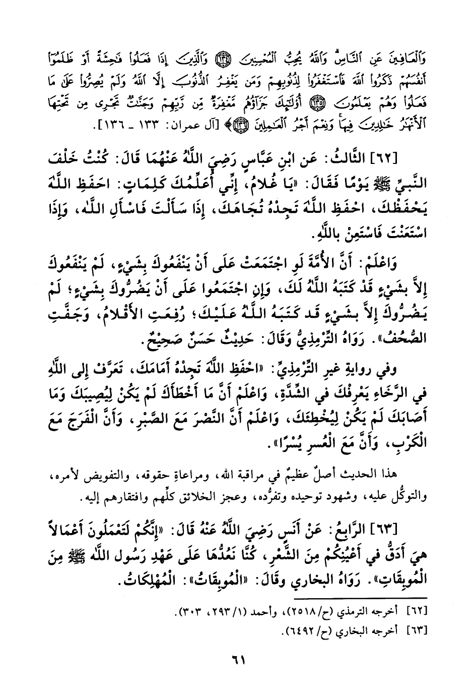 [89] الثالث: عن جابر - رضي الله عنه - قَالَ: قَالَ رجل للنبي - صلى الله عليه وسلم - يَومَ أُحُد: أَرَأيتَ إنْ قُتِلتُ فَأَيْنَ أَنَا؟ قَالَ: «في الجنَّةِ» فَأَلْقَى تَمَرَاتٍ كُنَّ في يَدِهِ، ثُمَّ قَاتَلَ حَتَّى قُتِلَ. مُتَّفَقٌ عَلَيهِ.