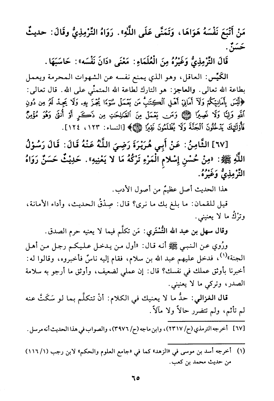 [95] فالأول: عن أبي هريرة - رضي الله عنه - قَالَ: قَالَ رَسُول الله - صلى الله عليه وسلم -: «إنَّ الله تَعَالَى قَالَ: مَنْ عادى لي وَلِيّاً فَقَدْ آذَنْتُهُ بالحَرْبِ، وَمَا تَقَرَّبَ إِلَيَّ عَبْدي بشَيءٍ أَحَبَّ إلَيَّ مِمَّا افْتَرَضْتُ عَلَيهِ، وَمَا يَزَالُ عَبْدِي يَتَقرَّبُ إلَيَّ بالنَّوافِلِ حَتَّى أحِبَّهُ، فَإذَا أَحبَبتُهُ كُنْتُ سَمعَهُ الَّذِي يَسْمَعُ بِهِ، وَبَصَرَهُ الَّذِي يُبْصِرُ بِهِ، ويَدَهُ الَّتي يَبْطِشُ بِهَا، وَرِجْلَهُ الَّتِي يَمْشي بِهَا، وَإنْ سَأَلَني لأُعْطِيَنَّهُ، وَلَئِنِ اسْتَعَاذَنِي لأُعِيذَنَّهُ» . رواه البخاري.
