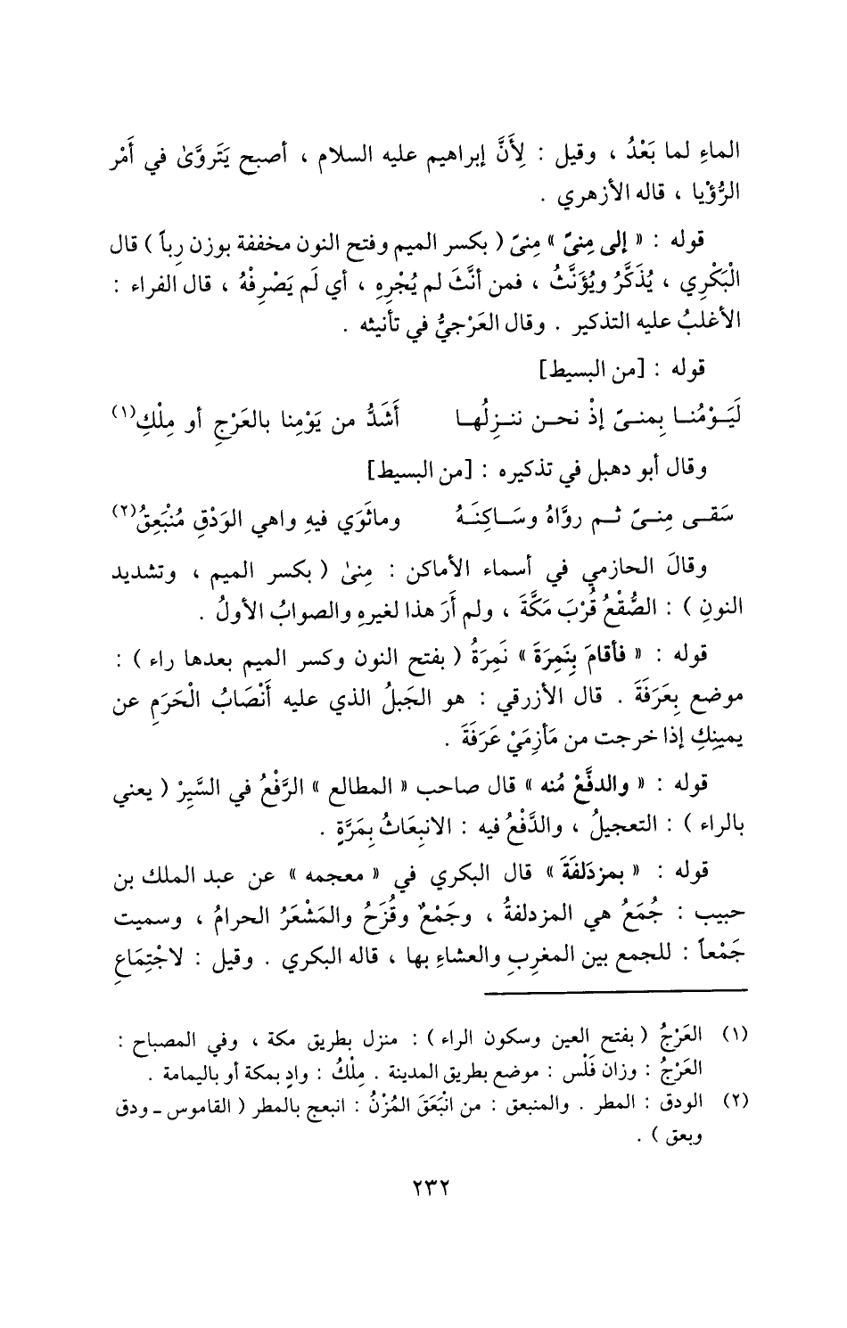 قوله: "إلى مِنًى" منى "بكسر الميم وفتح النون مخففة بوزن رِبًا" قال البكري، يذكر ويؤنث، فمن أنث لم يُجْرِه، أي لم يصرفه، قال الفراء: الأغلب عليه التذكير. وقال العرجي في تأنيثه. قوله: "من البسيط"