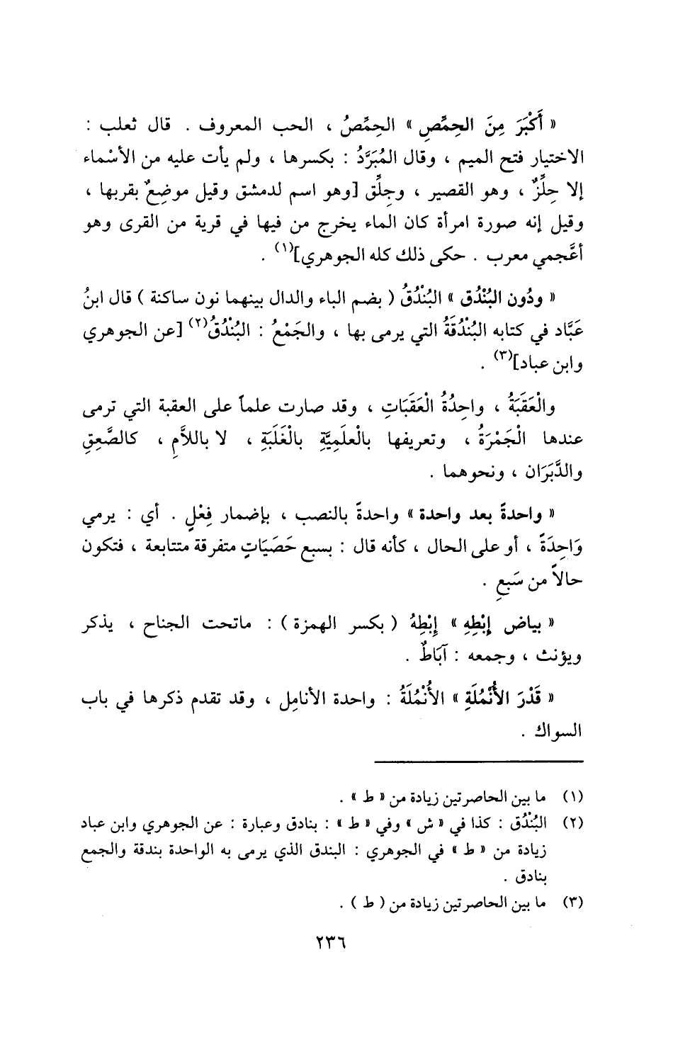 2 البندق: كذا في "ش" وفي "ط": بنادق وعبارة: عن الجوهري وابن عباد زيادة من "ط" في الجوهري: البندق الذي يرمى به الواحدة بندقة والجمع بنادق.