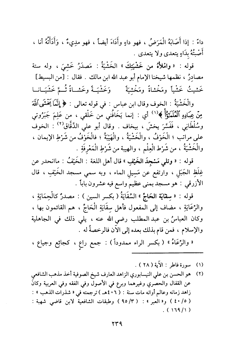والخَشْيَةُ: الخوف وقال ابن عباس: في قوله تعالى: {إِنَّمَا يَخْشَى اللَّهَ مِنْ عِبَادِهِ الْعُلَمَاءُ} 1 أي: إنما يخافني من خلقي، من علم جبروتي وسلطاني، ففسر يخش، بيخاف. وقال أبو علي الدقاق2: الخوف على مراتب الخوف، والخشية، والهيبة؛ فالخوف من شرط الإيمان، والخشية، من شرط العلم، والهيبة من شرط المعرفة.