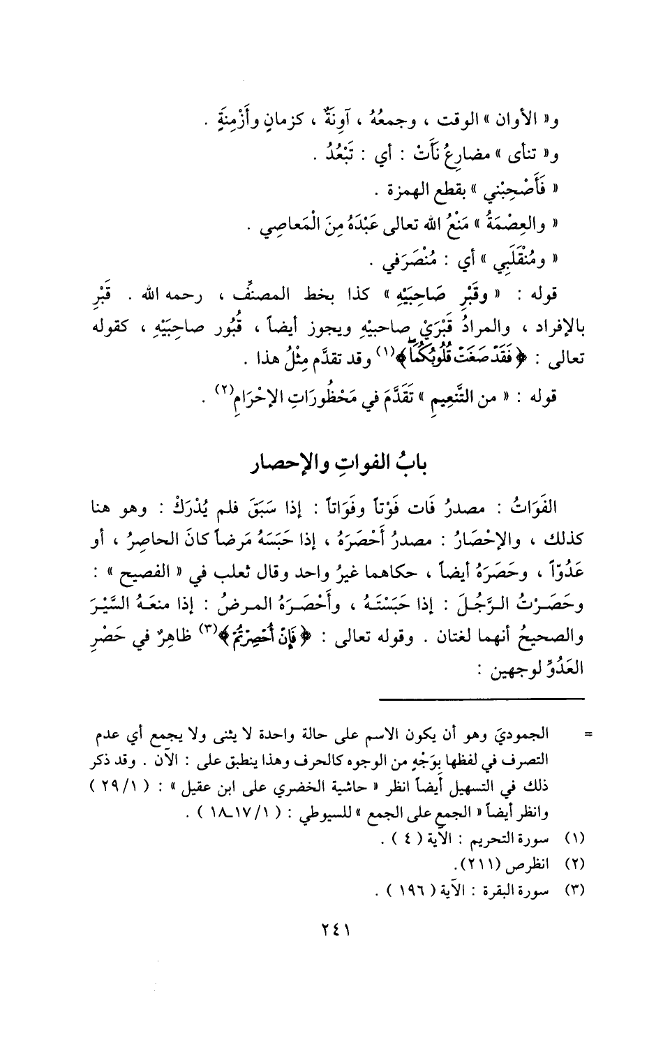 الفَوَاتُ: مصدر فات فوتاً وفواتاً: إذا سبق فلم يدرك: وهو هنا كذلك، والإحصار: ومصدر أحصره، إذا حبسه مرضًا كان الحاصر، أو عدوًّا، وحصره أيضًا، حكاهما غير واحد وقال ثعلب في "الفصيح": وحصرت الرجل: إذا حبسته، وأحصره المرض: إذا منعه السير والصحيح أنهما لغتان. وقوله تعالى: {فَإنْ أُحْصِرْتُمْ} 1 ظاهر في حصر العدو لوجهين: