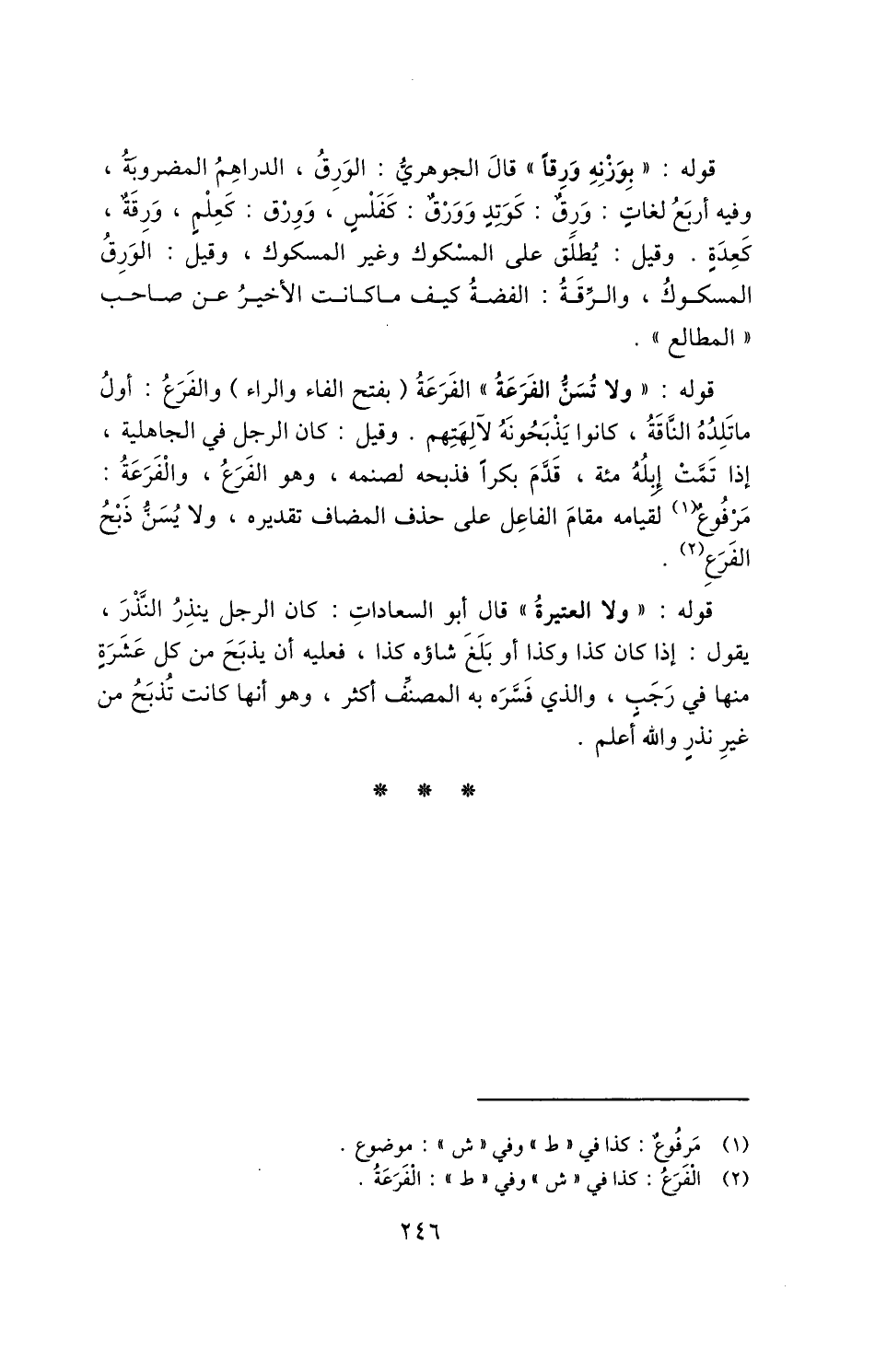 قوله: "ولا تُسَنُّ الفَرَعَةُ" الفرعة "بفتح الفاء والراء" والفرع: أول ما تلده الناقة، كانوا يذبحونه لآلهتهم. وقيل: كان الرجل في الجاهلية، إذا تمت إبله مئة، قدم بكرًا فذبحه لصنمه، وهو الفرع، والفرعة: مرفوع1 لقيامه مقام الفاعل على حذف المضاف تقديره، ولا يسن ذبح الفرع2.