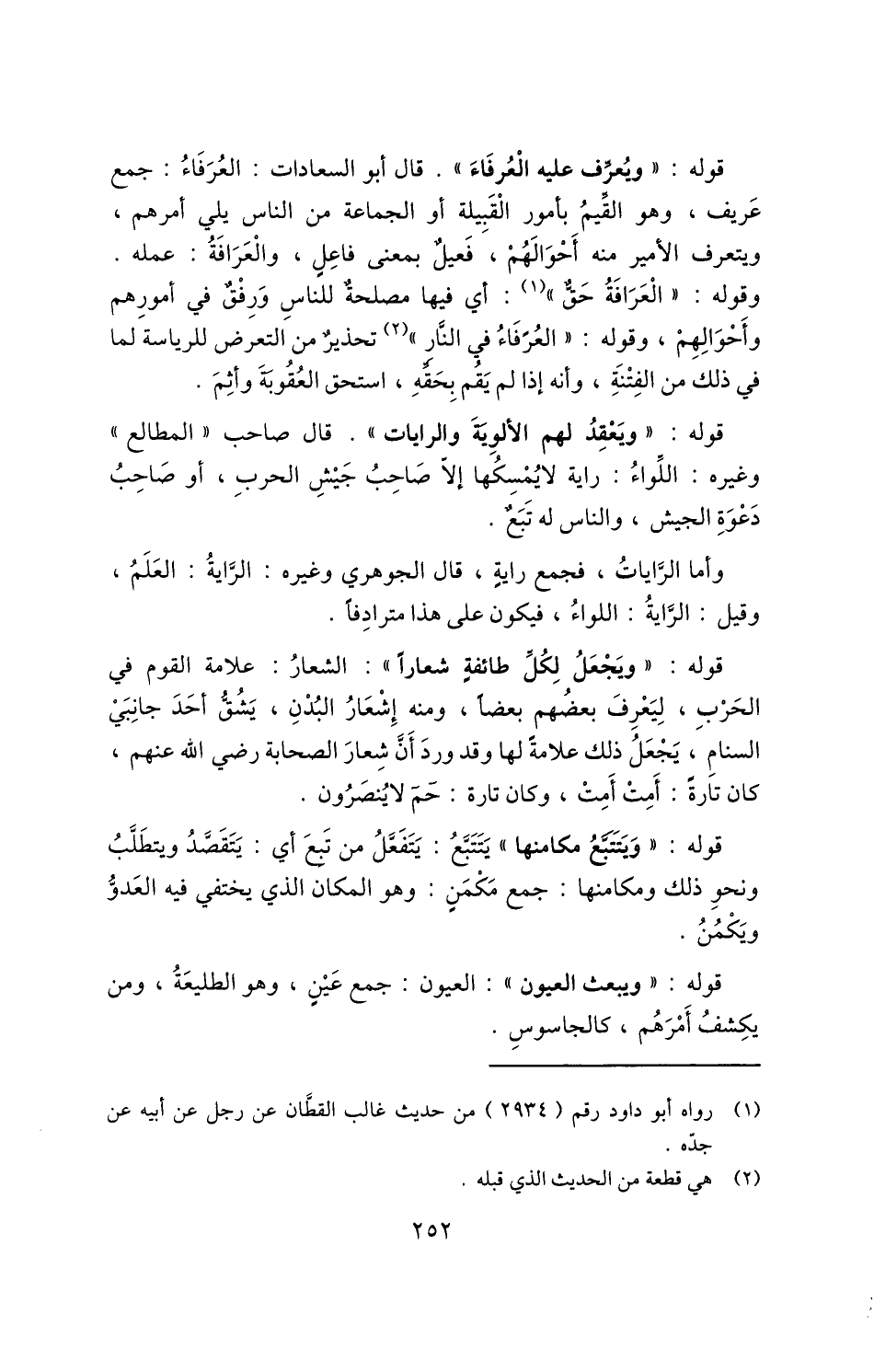 قوله: "ويُعرِّف عليه الْعُرَفَاءَ". قال أبو السعادات: العرفاء: جمع عريف، وهو القيم بأمور القبيلة أو الجماعة من الناس يلي أمرهم، ويتعرف الأمير منه أحوالهم، فعيل بمعنى فاعل، والعرافة: عمله. وقوله: "الْعَرَافَةُ حَقٌّ"1: أي فيها مصلحةٌ للناس ورفق في أمورهم وأحوالهم، وقوله: "العُرَفَاءُ في النَّارِ"2 تحذير من التعرض للرياسة لما في ذلك من الفتنة، وأنه إذا لم يقم بحقه، استحق العقوبة وأثم.