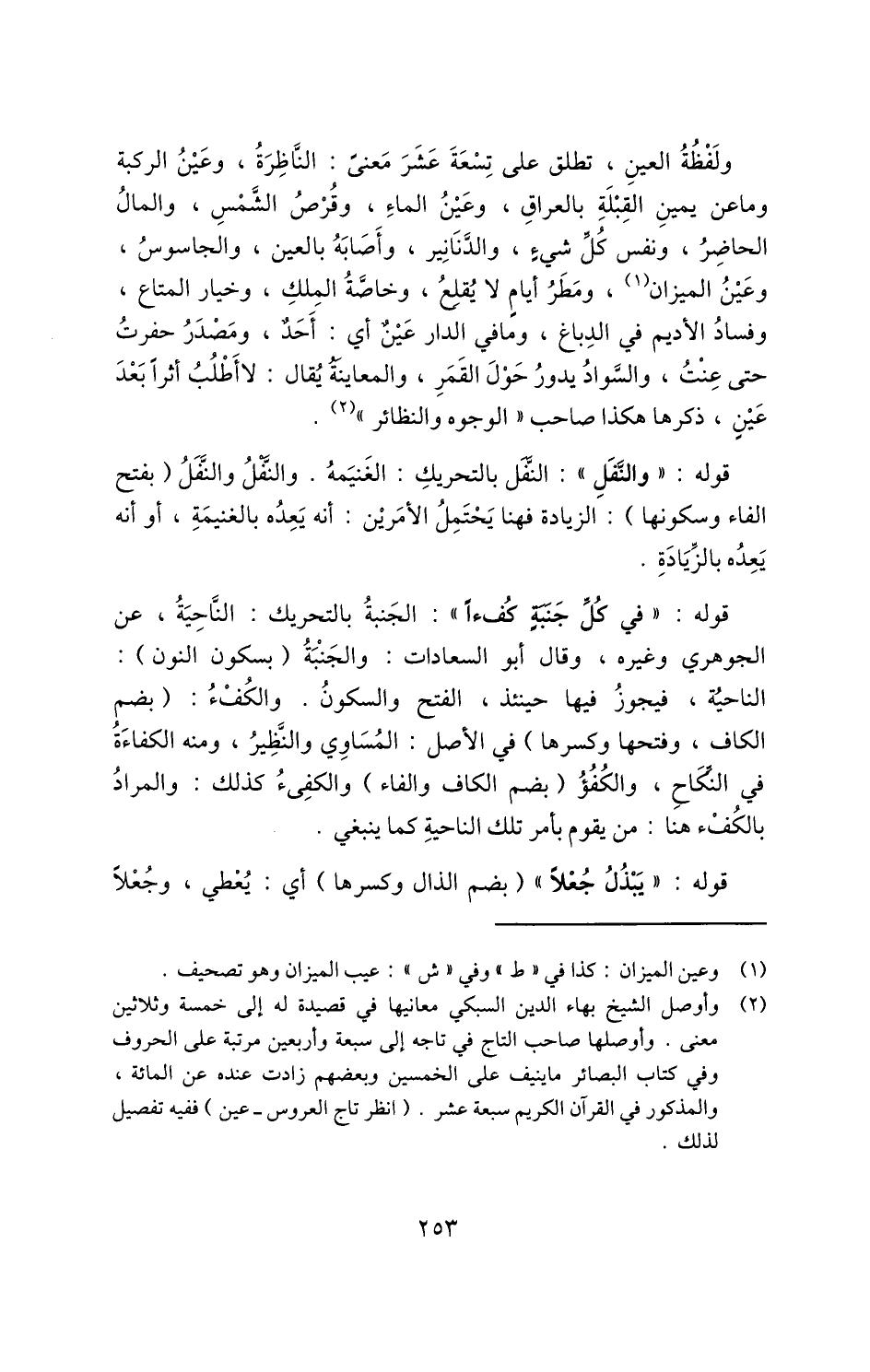 ولفظة العين، تطلق على تسعة عشر معنى: الناظرة، وعين الركبة وما عن يمين القبلة بالعراق، وعين الماء، وقرص الشمس، والمال الحاضر، ونفس كل شيء، والدنانير، وأَصَابَهُ بالعين، والجاسوس، وعين الميزان1، ومطر أيام لا يقلع، وخاصة الملك، وخيار المتاع، وفاد الأديم في الدباغ، وما في الدار عين أي: أحد، ومصدر حفرت حتى عنت، والسواد يدور حول القمر، والمعاينة يقال: لا أطلب أثرًا بعد عين، ذكرها هكذا صاحب "الوجوه والنظائر"2.