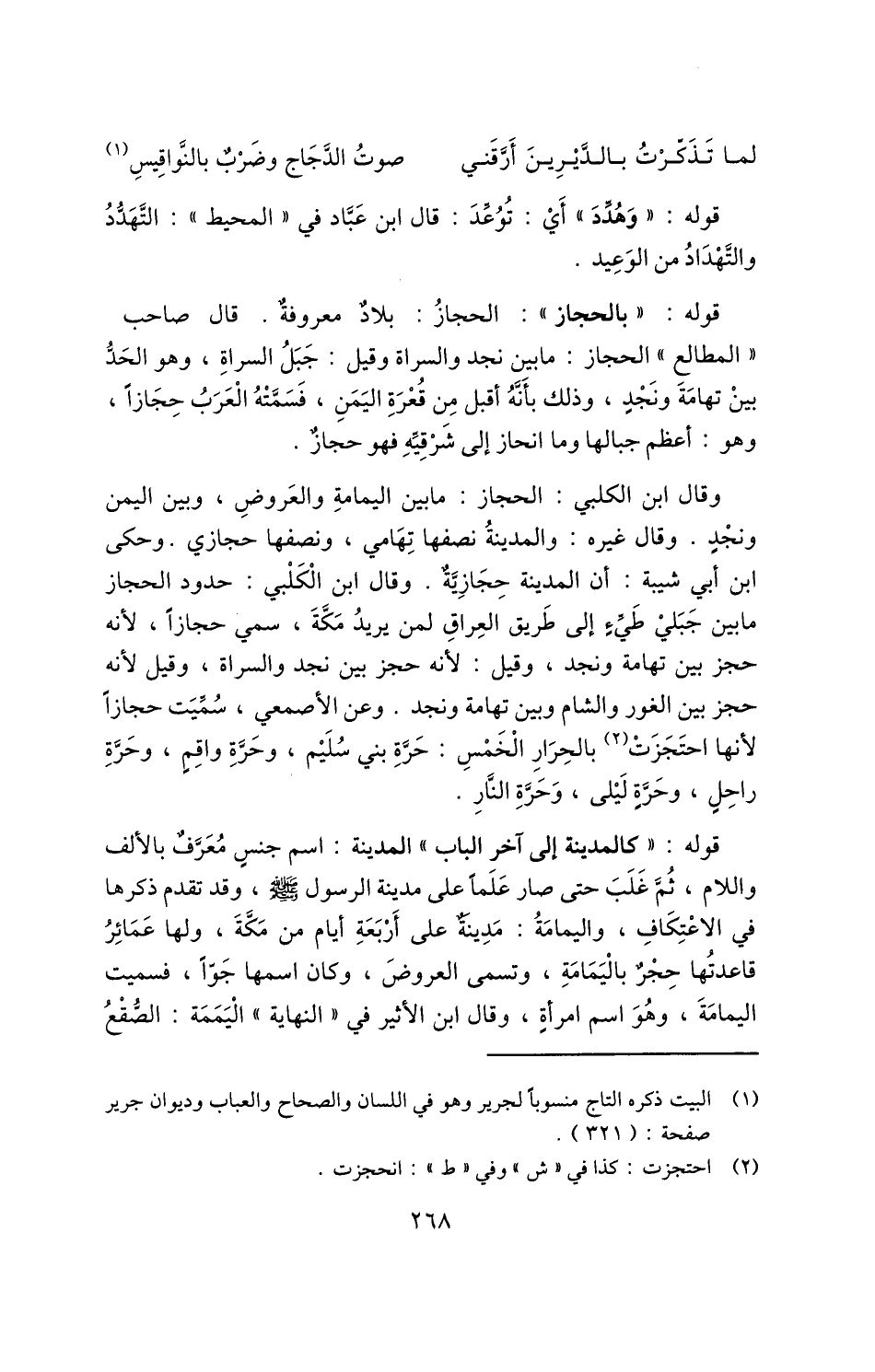 وقال ابن الكلبي: الحجاز: ما بين اليمامة والعروض، وبين اليمن ونجد. وقال غيره: والمدينةُ نصفها تهامي، ونصفها حجازي. وحكى ابن أبي شيبة: أن المدينة حجازية. وقال ابن الكلبي: حدود الحجاز ما بين جبلي طيءٍ إلى طريق العراق لمن يريد مكة، سمي حجازاً؛ لأنه حجز بين تهامة ونجد، وقيل: لأنه حجز بين نجد والسراة، وقيل: لأنه حجز بين الغور والشام وبين تهامة ونجد. وعن الأصمعي، سُمِّيَت حجازاً؛ لأنها احتجزت2 بالحرار الخمس: حرَّةِ بني سُليم، وحرَّة واقم، وحرَّة راحل، وحرَّة ليلى، وحرَّة النَّار.