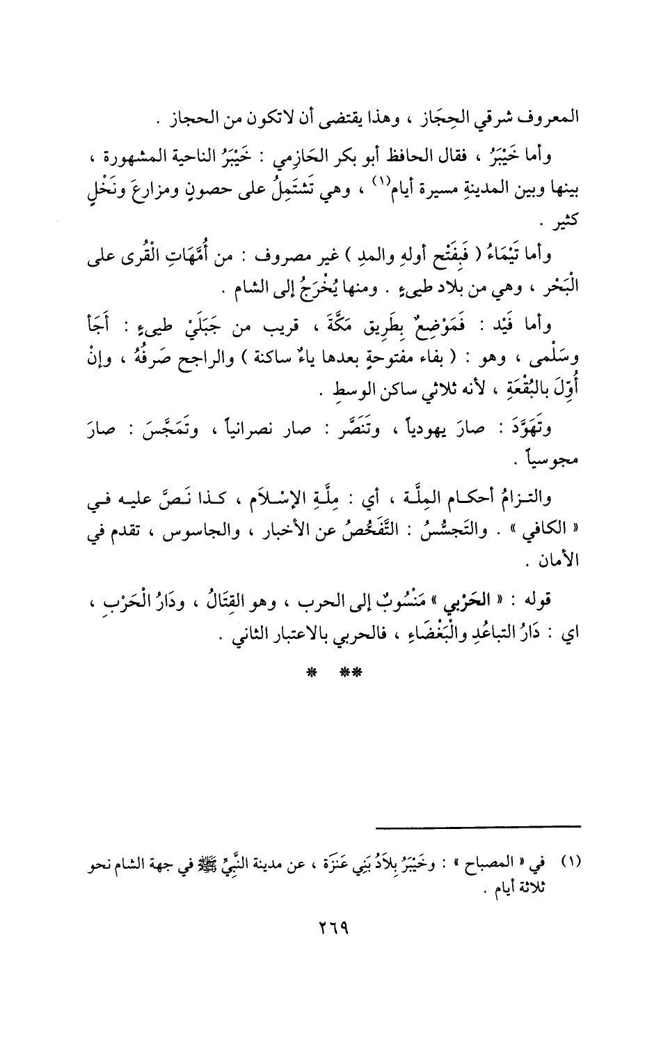 1 في "المصباح": وخَيْبَرُ بلاد بَنِي عَنَزَة، عن مدينة النبي صلى الله عليه وسلم في جهة الشام نحو ثلاثة أيام.