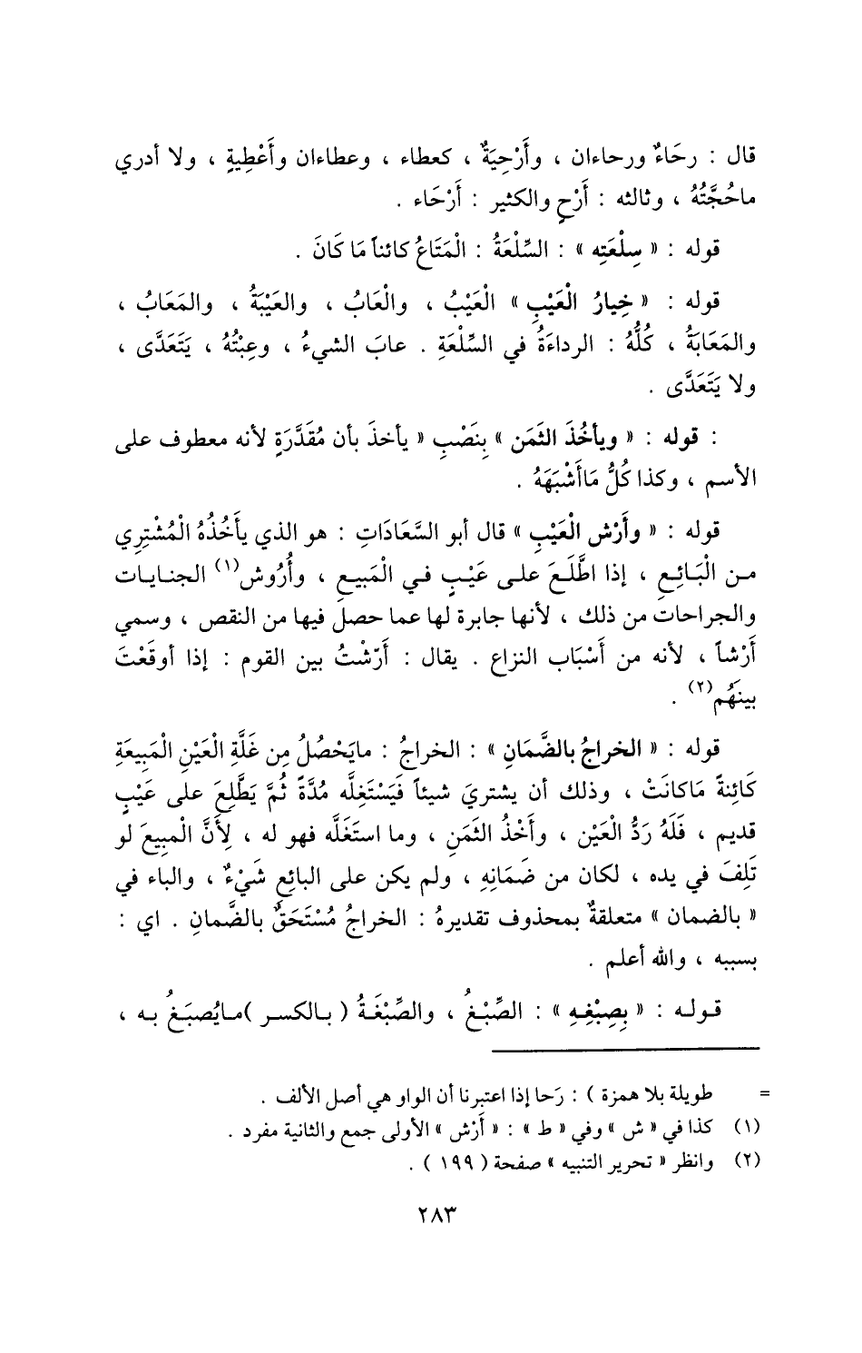 قوله: "وأَرْش العَيْبِ" قال أبو السعادات: هو الذي يأخذه المشتري من البائع، إذا اطَّلع على عيب في المبيع، وأروش1 الجنايات والجراحات من ذلك؛ لأنها جابرة لها عما حصل فيها من النقص، وسمي أرشًا؛ لأنه من أسباب النزاع. يقال: أرشت بين القوم: إذا أوقعت بينهم2.