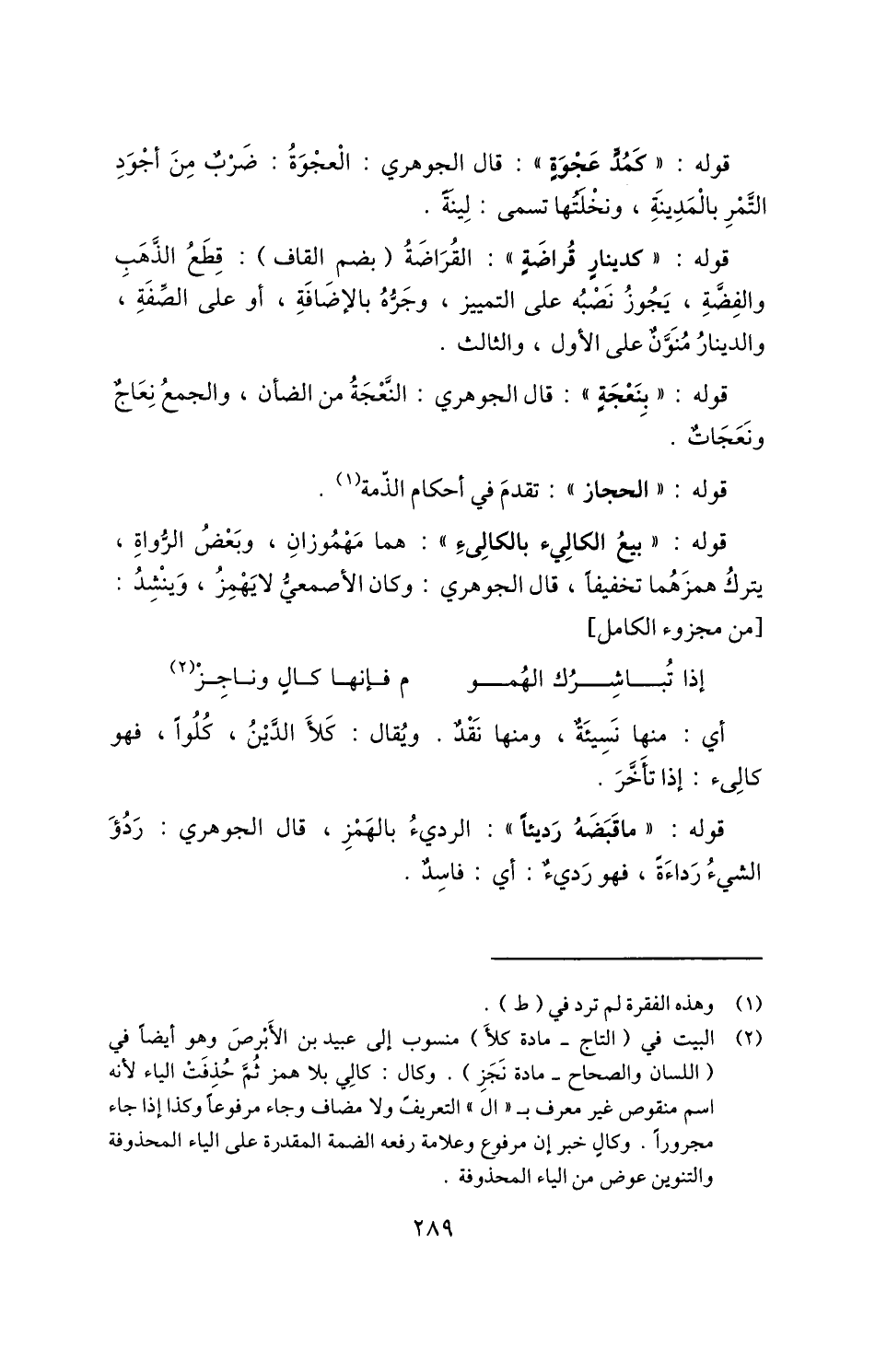 2 البيت في "التاج - مادة كلأَ". منسوب إلى عبيد بن الأبرص، وهو أيضا في "اللسان والصحح - مادة نَجَزِ". وكال: كالي بلا همز ثم حذفت الياء؛ لأنه اسم منقوص غير معرف بـ"ال" التعريف ولا مضاف وجاء مرفوعًا وكذا إذا جاء مجرورًا، وكالٍ خبر إن مرفوع وعلامة رفعه الضمة المقدرة على الياء المحذوفة والتنوين عوض من الياء المحذوفة.