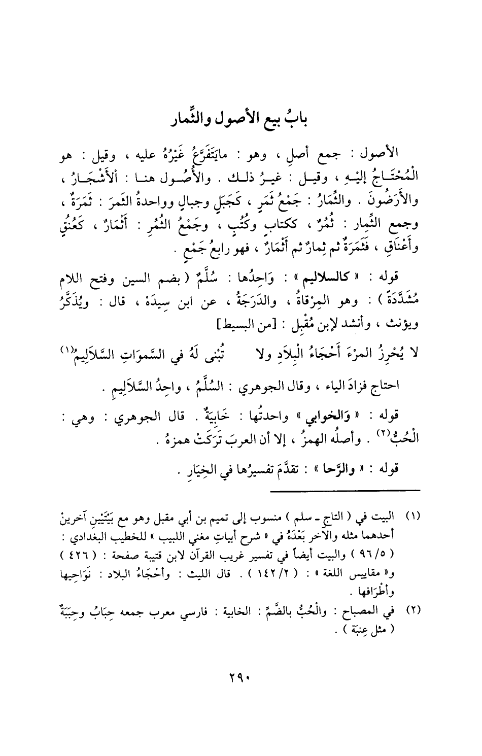 الأصول: جمع أصل، وهو: ما يَتَفَرَّعُ غيره عليه، وقيل: هو المحتاج إليه، وقيل: غير ذلك. والأصول هنا: الأشجار، والأرضون، والثمار: جمع ثمر، كجبل وجبال وواحدة الثمر: ثمرة، وجمع الثمار: ثمر، ككتاب وكتب، وجمع الثمر: أثمار، كعنق وأعناق، فَثَمَرَةٌ ثم ثِمَارٌ ثم أَثْمَارٌ، فهو رابعُ جَمْعٍ.
