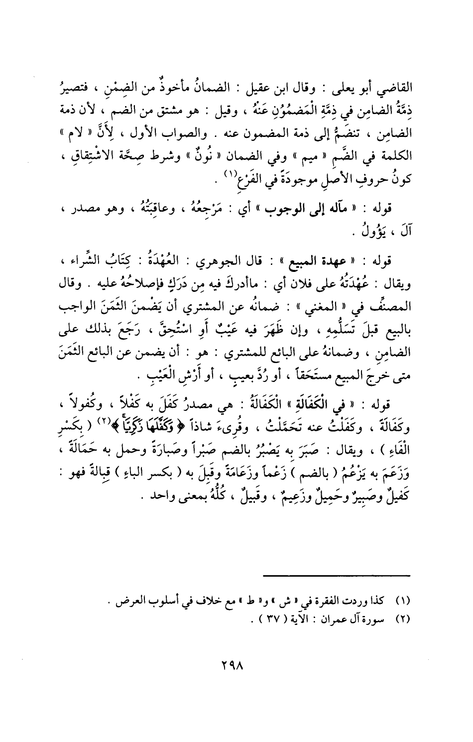 القاضي أبو يعلى: وقال ابن عقيل: الضمان مأخوذ من الضمن، فتصير ذمة الضامن في ذمة المضمون عنه، وقيل: هو مشتق من الضم؛ لأن ذمة الضامن، تنضم إلى ذمة المضمون عنه، والصواب الأول؛ لأن "لام" الكلمة في الضم "ميم" وفي الضمان "نون" وشرط صحة الاشتقاق، كون حروف الأصل موجودةً في الفَرْعِ1.