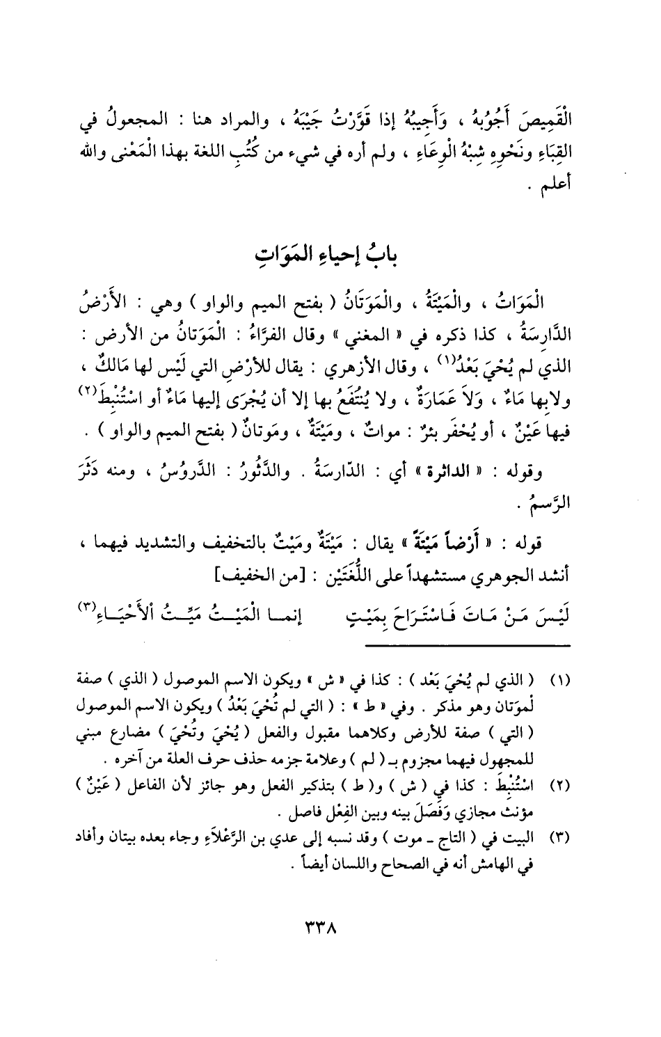1 "الذي لم يُحْيَ بعد": كذا في "ش" ويكون الاسم الموصول "الذي" صفة لموتان وهو مذكر. وفي "ط": "التي لم تحي بعد" ويكون الاسم الموصول "التي" صفة للأرض وكلاهما مقبول والفعل "يحي وتحي" مضارع مبني للمجهول فيهما مجزوم بـ "لم" وعلامة جومه حذف حرف العلة من آخره.