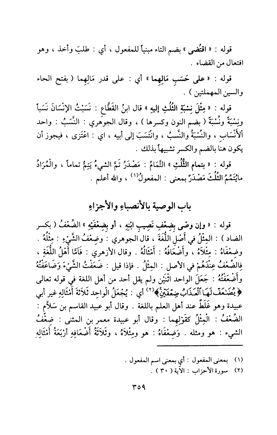 قوله: "وإن وصَّى بِضِعْفِ نَصِيْبِ ابْنِهِ، أو بِضِعْفَيْهِ" الضعف "بكسر الضاد": المثل في أصل اللغة، قال الجوهري: وضعف الشيء: مثله. وضعفاه: مثلاه، وأضعافه: أمثاله. وقال الأزهري: فأما أهل اللغة، فالضعف عندهم في الأصل: المثل. فإذا قيل: ضعفت الشيء وضاعفته وأضعفته: جعل الواحد اثنين ولم يقل أحد من أهل اللغة في قوله تعالى: {يُضَاعَفْ لَهَا الْعَذَابُ ضِعْفَيْنِ} 1 أي: يجعل الواحد ثلاثة أمثاله غير أبي عبيدة، وهو غلط عند أهل العلم باللغة، وقال أبو عبيد القاسم بن سلام: الضعف: المثل كقولهما: وقال أبو عبيدة معمر بن المثنى: ضعف الشيء: هو ومثله، وضعفاه: هو ومثلاه، وثلاثة أضعافه أربعة أمثاله