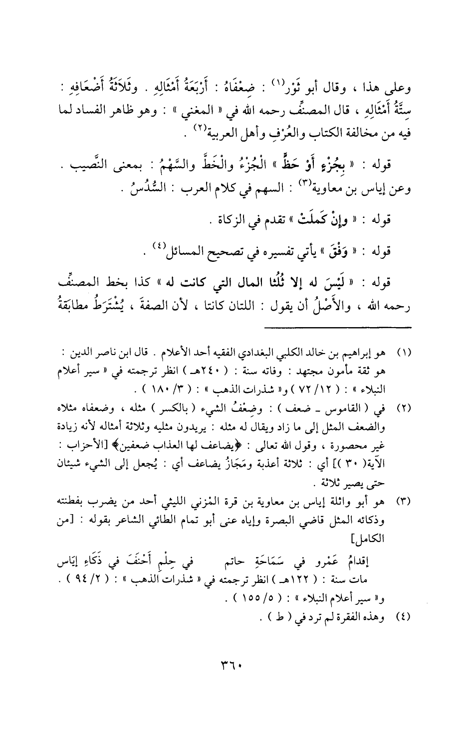2 في "القاموس - ضعف": وضعف الشيء "بالكسر" مثله، وضعفاه مثلاه والضعف المثل إلى ما زاد ويقال له مثله: يريدون مثليه وثلاثة أمثال؛ لأنه زيادة غير محصورة، وقول الله تعالى: {يُضَاعَفْ لَهَا الْعَذَابُ ضِعْفَيْنِ} "الأحزاب: الآية 30" أي: ثلاثة أعذبة ومجاز يضاعف أي: يجعل إلى الشيء شيئان حتى يصير ثلاثة.