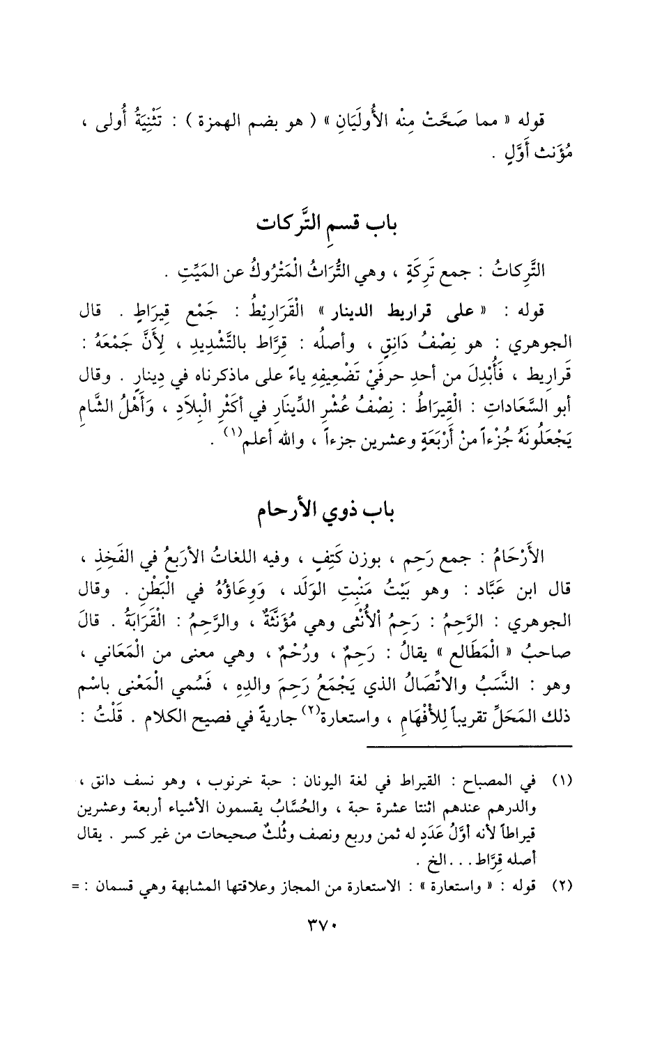 1 في المصباح: القيراط في لغة اليونان: حبة خرنوب، وهو نسف دانق، والدرهم عندهم اثنتا عشرة حبة، والحساب يقسمون الأشياء أربعة وعشرين قيراطًا؛ لأنه أول عدد له ثمن وربع ونصف وثلث صحيحات من غير كسر، يقال أصله قِرَّاط ... الخ.