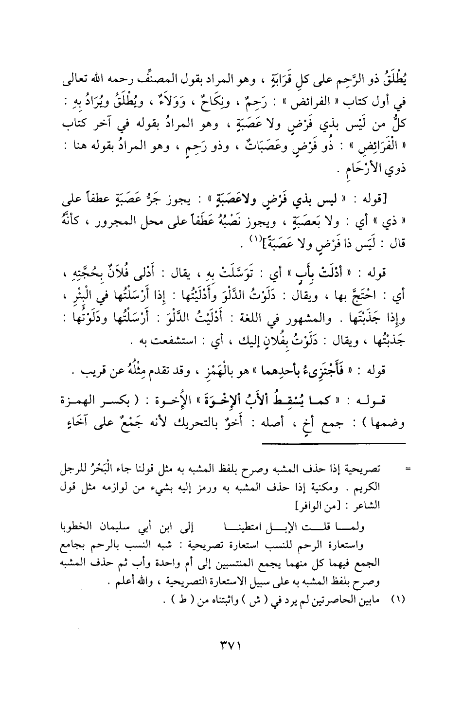 "قوله: "ليس بذي فَرْضٍ ولا عَصَبَةٍ": يجوز جر عصبة عطفاً على "ذي" أي: ولا بعصبة، ويجوز نصبه عطفًا على محل المجرور، كأنه قال: ليس ذا فرض ولا عصبة"1.