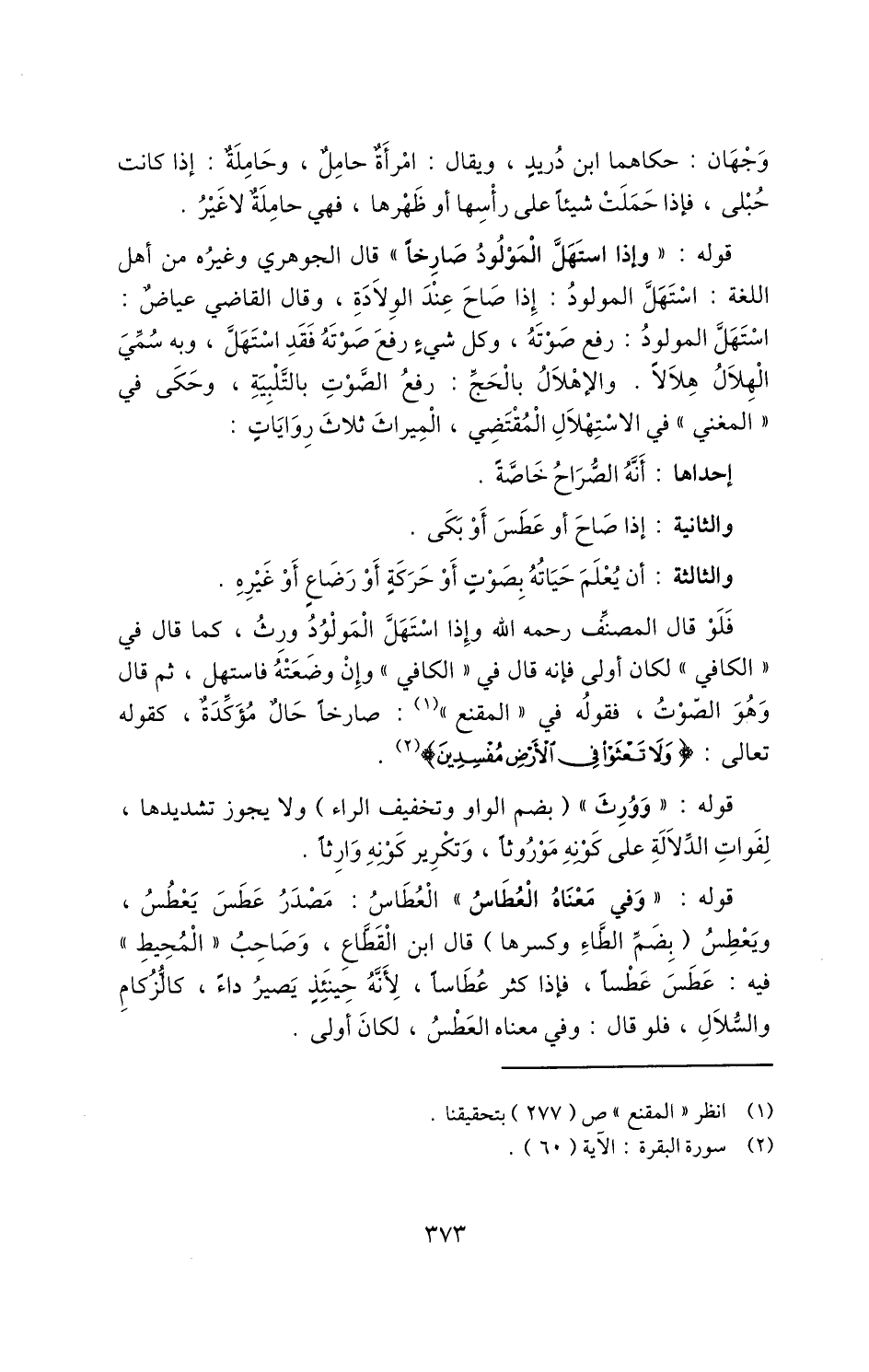 فلو قال المصنف -رحمه الله- وإذا استهل المولود ورث، كما قال في "الكافي" لكان أولى فإنه قال في "الكافي" وإن وضعته فاستهل، ثم قال وهو الصوت، فقوله في "المقنع"1: صارخًا حال مؤكدة، كقوله تعالى: {وَلا تَعْثَوْا فِي الْأَرْضِ مُفْسِدِينَ} 2.