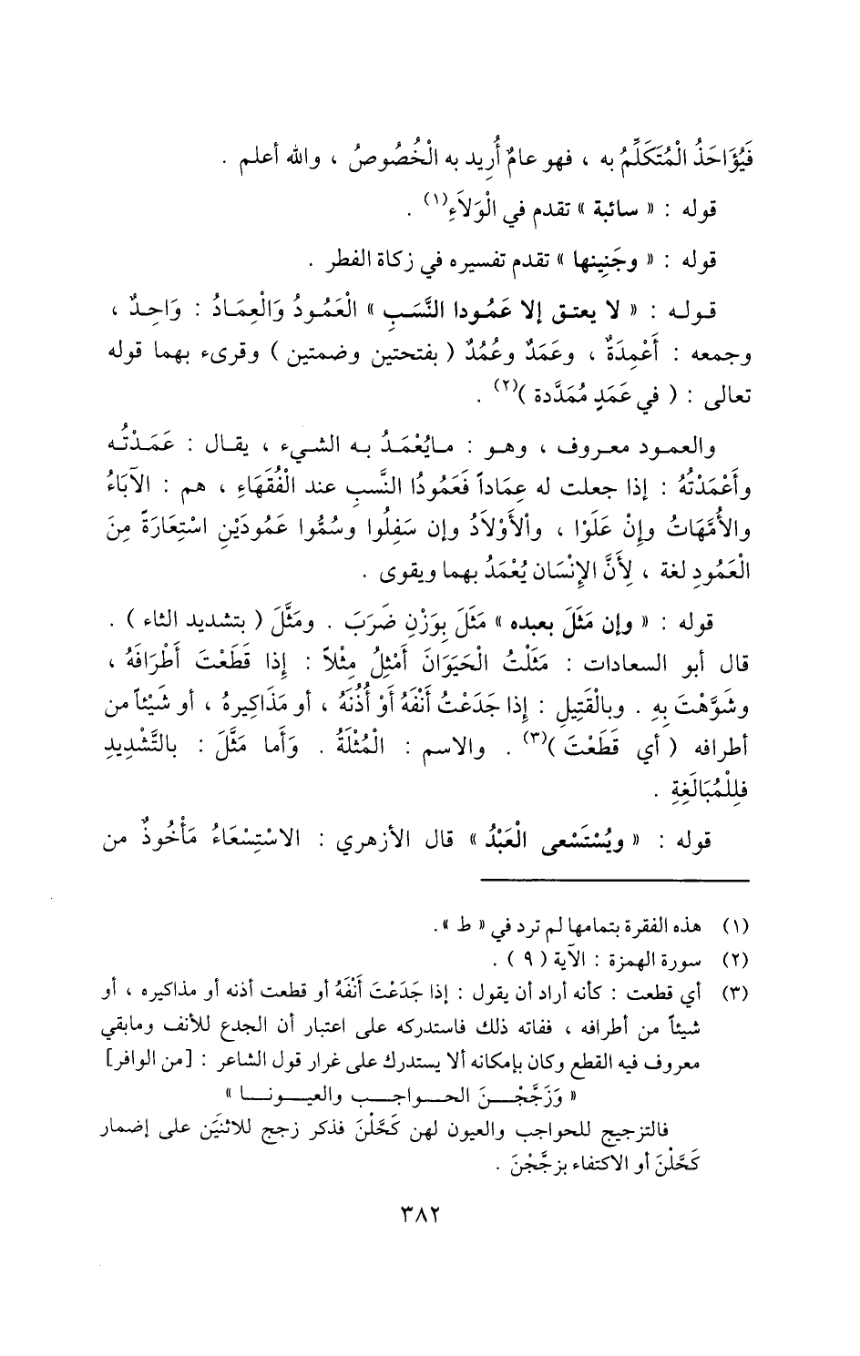 قوله: "لا يعتق إلا عَمُودا النَّسَبِ" العمود والعماد: واحد، وجمعه: أعمدة، وعَمَدٌ وعُمُدٌ "بفتحتين وضمتين" وقرئ بهما قوله تعالى: {فِي عَمَدٍ مُمَدَّدَةٍ} 2.
