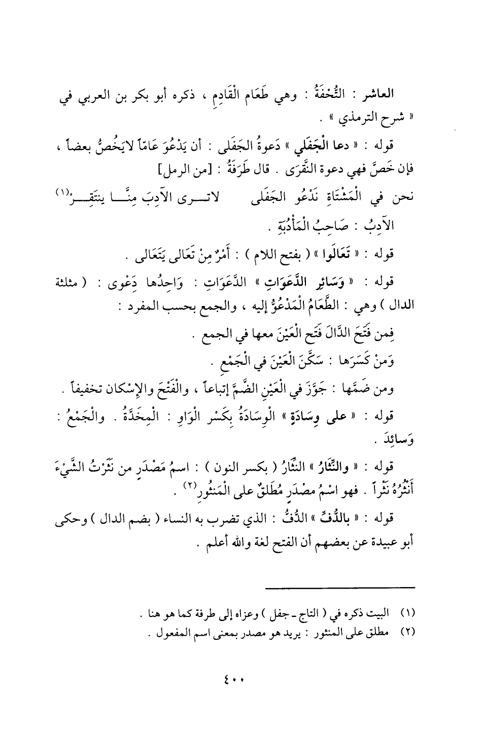 العاشر: التُّحْفَةُ: وهي طعام القادم، ذكره أبو بكر بن العربي في "شرح الترمذي".
