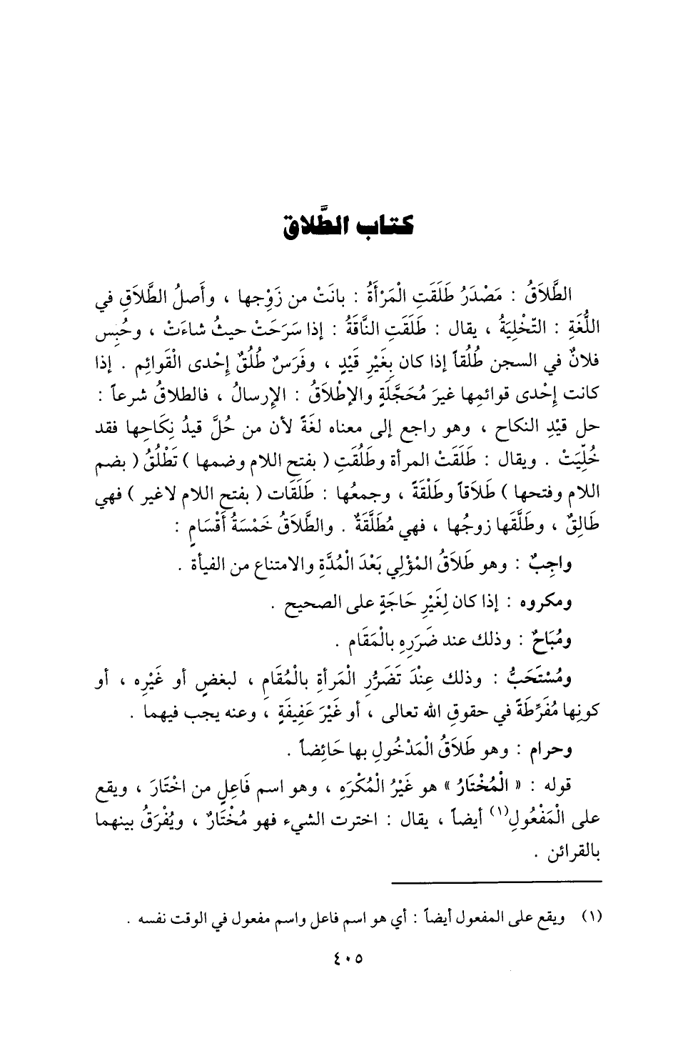 الطَّلَاقُ: مصدر طلقت المرأة: بانت من زوجها، وأصل الطلاق في اللغة: التخلية، يقال: طلقت الناقة: إذا سرحت حيث شاءت، وحبس فلان في السجن طلقًا إذا كان بغير قيد، وفرس طلق إحدى القوائم، إذا كانت إحدى قوائمها غير محجلة والإطلاق: الإرسال، فالطلاق شرعًا: حل قيد النكاح، وهو راجع إلى معناه لغة؛ لأن من حل قيد نكاحها فقد خليت، ويقال: طلقت المرأة وطلقت "بفتح اللام وضمها" تطلق "بضم اللام وفتحها" طلاقًا وطلقة، وجمعها: طلقات "بفتح اللام لا غير" فهي طالق، وطلقها زوجها، فهي مطلقة، والطلاق خمسة أقسام: