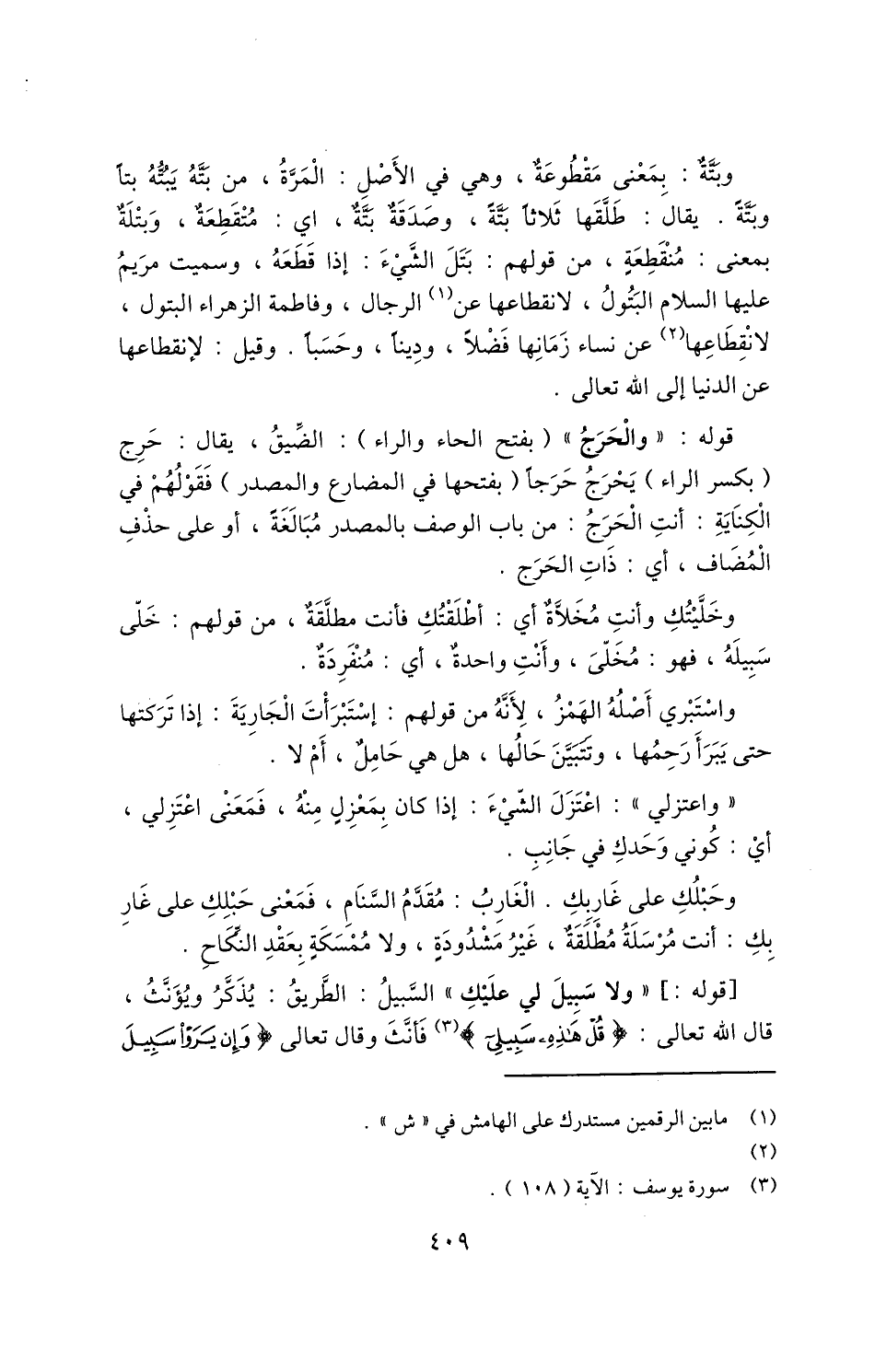 قوله: "والْحَرَجُ" "بفتح الحاء والراء": الضيق، يقال: حرج "بكسر الراء" يحرج حرجًا "فتحها في المضارع والمصدر" فقولهم في الكناية: أنت الحرج: من باب الوصف بالمصدر مبالغة، أو على حذف المضاف، أي: ذات الحرج.