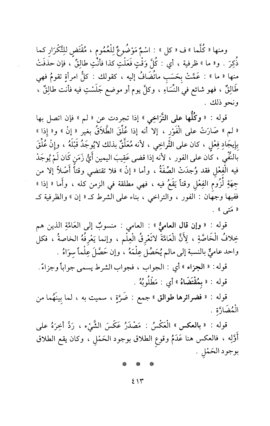 ومنها "كُلَّمَا" ف "كل": اسم موضوع للعموم، مقتض للتكرار كما ذكر، و "ما" ظرفية، أي: كل وقت فعلت كذا فأنت طالق، فإن حذفت منها "ما": عمت بحسب ما تضاف إليه، كقولك: كل امرأة تقوم فهي طالق، فهو شائع في النساء، وكل يوم أو موضع جلست فيه فأنت طالق، ونحو ذلك.