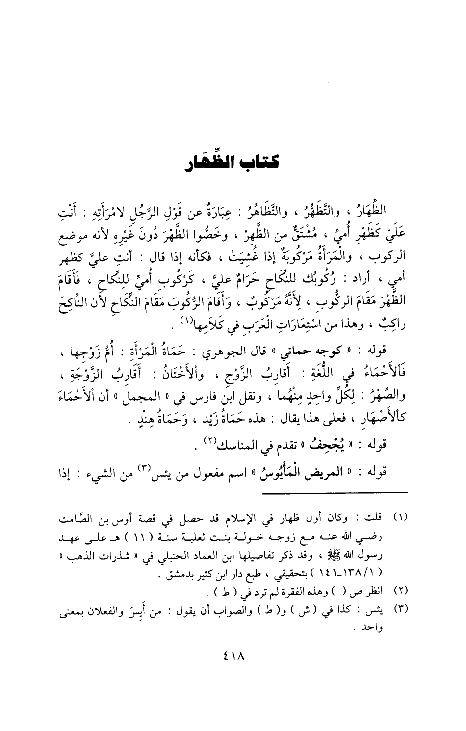 1 قلت: وكان أول ظهار في الإسلام قد حصل في قصة أوس بن الصامت رضي الله عنه مع زوجه خولة بنت ثعلبة سنة "11" هـ على عهد رسول الله صلى الله عليه وسلم، وقد ذكر تفاصيلها ابن العماد الحنبلي في "شذرات الذهب" "1/ 138-141" بتحقيقي، طبع دار ابن كثير بدمشق.