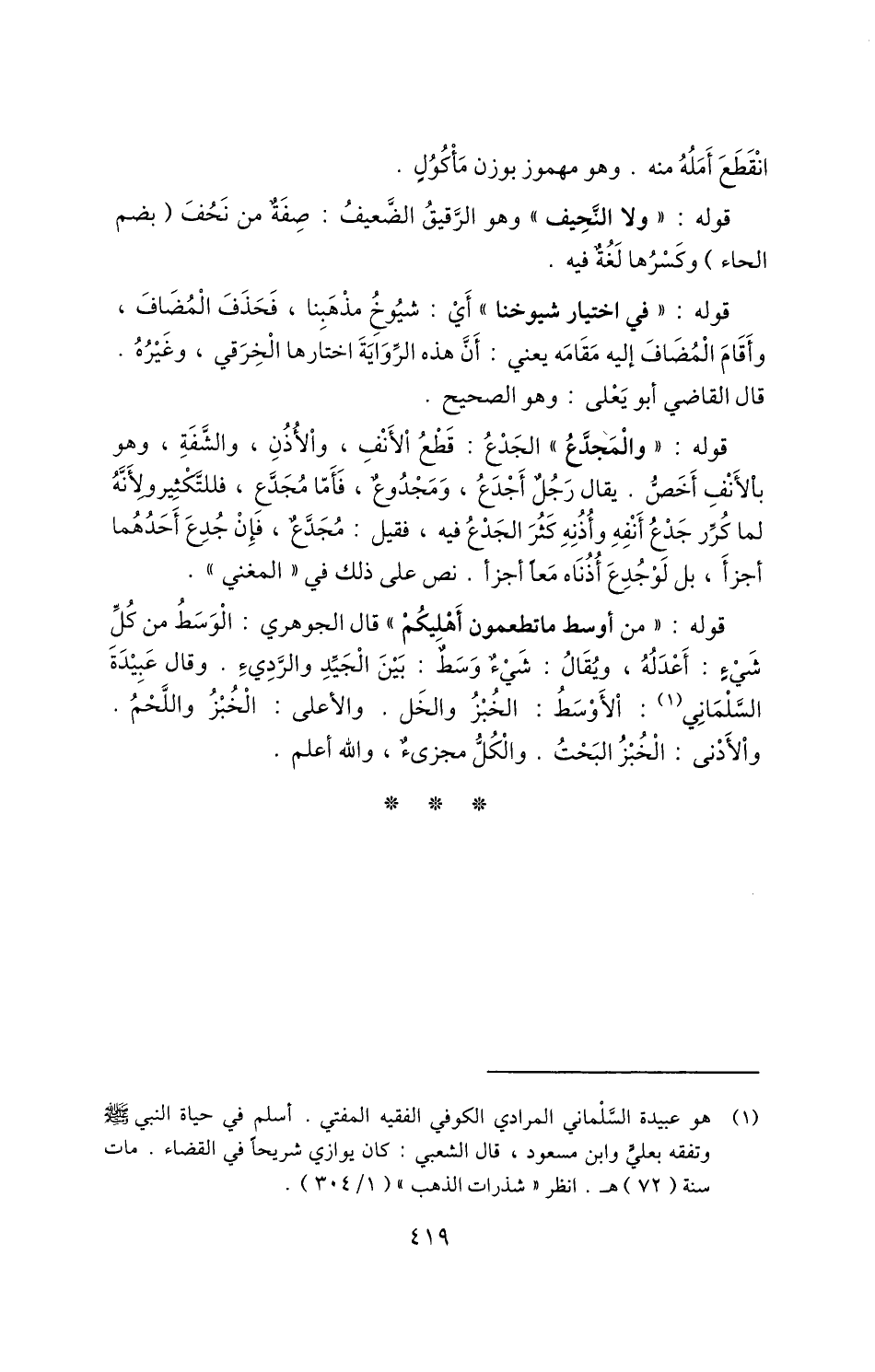 1 هو عبيدة السلماني المرادي الكوفي الفقيه المفتي، أسلم في حياة النبي صلى الله عليه وسلم وتفقه بعليٍّ وابن مسعود، قال الشَّعْبِي: كان يوازي شريحًا في القضاء. مات سنة "72" هـ. انظر "شذرات الذهب" "1/ 304".