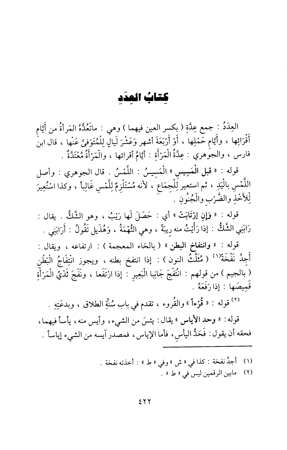 العِدَدُ: جمع عدة "بكسر العين فيهما" وهي: ما تعده المرأة من أيام أقرائها، وأيام حملها، أو أربعة أشهر وعشر ليال للمتوفى عنها، قال ابن فارس، والجوهري: عدة المرأة: أيام أقرائها، والمرأة معتدة.