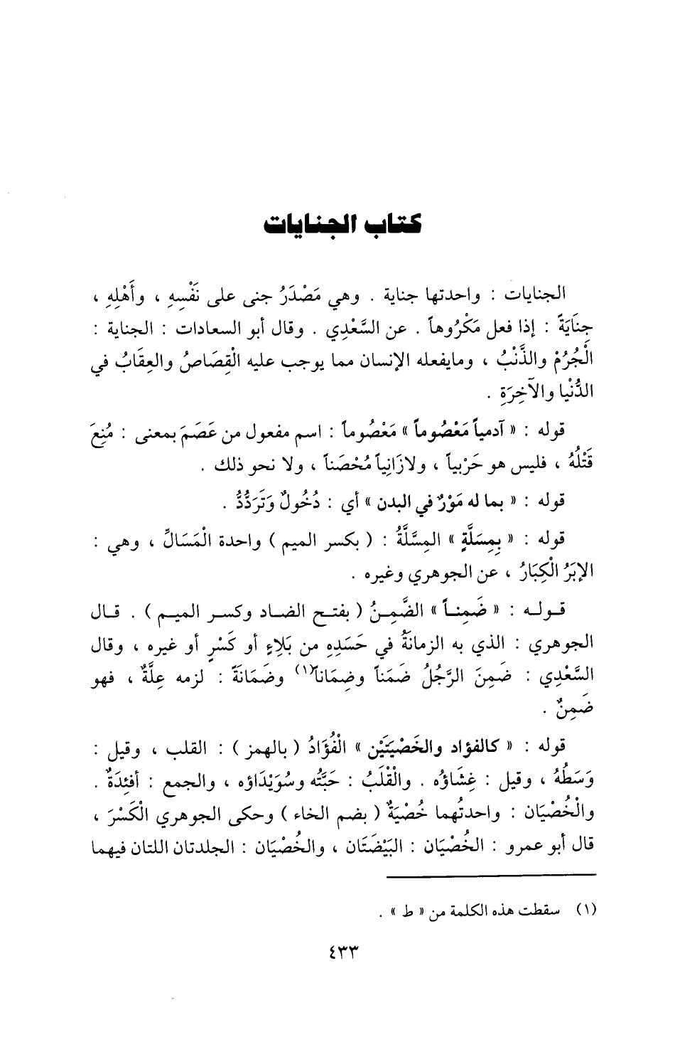 الجنايات: واحدتها جناية، وهي مصدر جنى على نفسه، وأهله، جناية: إذا فعل مكروهًا. عن السعدي. وقال أبو السعادات: الجناية: الجرم والذنب، وما يفعله الإنسان مما يوجب عليه القصاص والعقاب في الدنيا والآخرة.