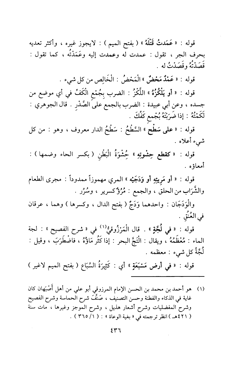 1 هو أحمد بن محمد بن الحسن الإمام المرزوقي في أبو علي من أهل أصبهان كان غاية في الذكاء والفطنة وحسن التصنيف، صنف شرح الحماسة وشرح الفصيح وشرح المفضليات وشرح أشعار هذيل، وشرح الموجز وغيرها، مات سنة "421"هـ انظر ترجمته في "بغية الوعاة": "1/ 365".