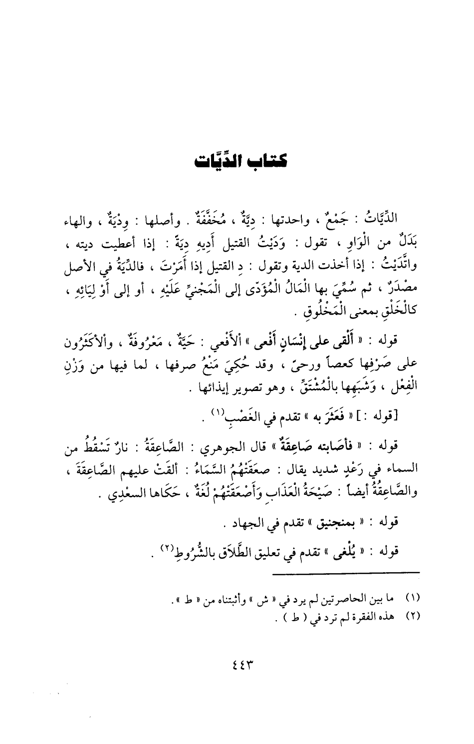 الديات: جمع، واحدتها: دية، مخففة. وأصلها: ودية، والهاء بدل من الواو، تقول: وَدَيْتُ القتيل أديه دية: إذا أعطيت ديته، واتَّدَيْتُ: إذا أخذت الدية وتقول: د القتيل إذا أمرت، فالدية في الأصل مصدر، ثم سمي بها المال المؤدى إلى المجني عليه، أو إلى أوليائه، كالخلق بمعنى المخلوق.