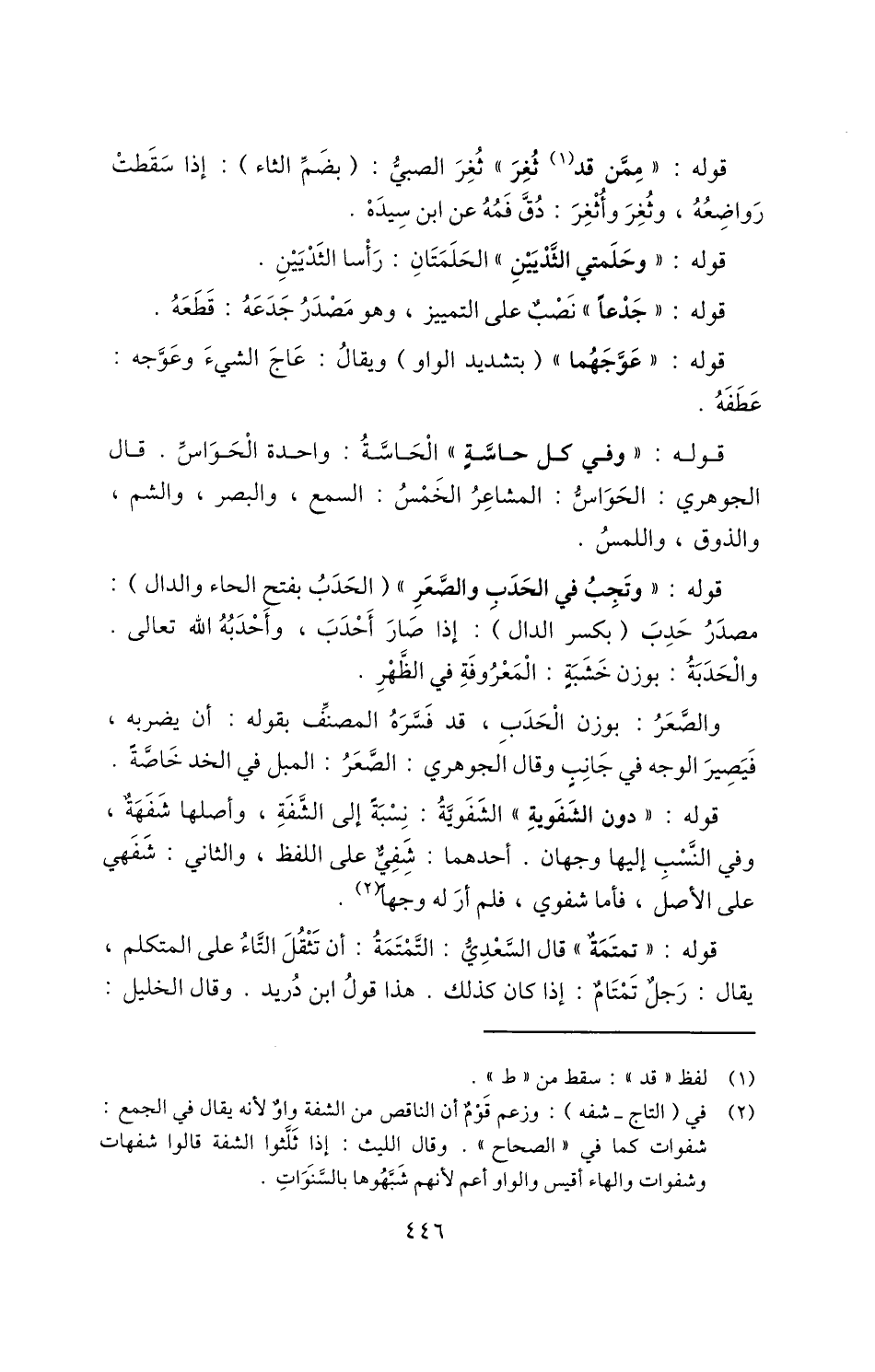2 في "التاج - شفه": وزعم قوم أن الناقص من الشفة واو؛ لأنه يقال في الجمع: شفوات كما في "الصحاح". وقال الليث: إذا ثلثوا الشفة قالوا شفهات وشفوات والهاء أقيس والواو أعم؛ لأنهم شبهوها بالسنوات.