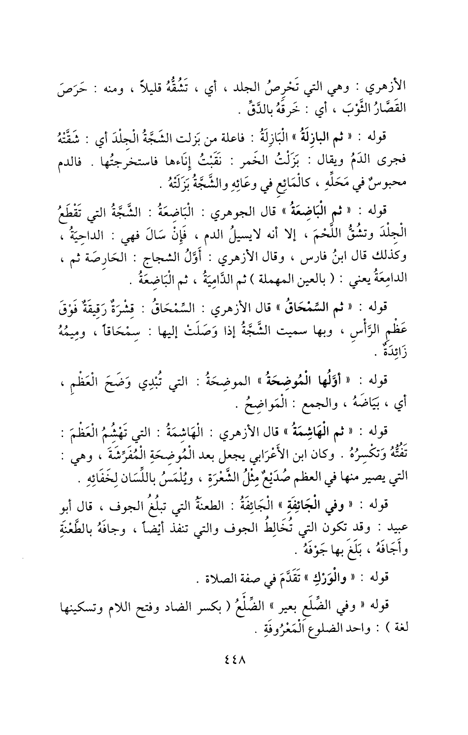 قوله: "ثم البازِلَةُ" البازلة: فاعلة من بزلت الشجة الجلد أي: شقته فجرى الدم ويقال: بزلت الخمر: نقبت إناءها فاستخرجتها. فالدم محبوس في محله، كالمائع في وعائه والشجة بزلته.