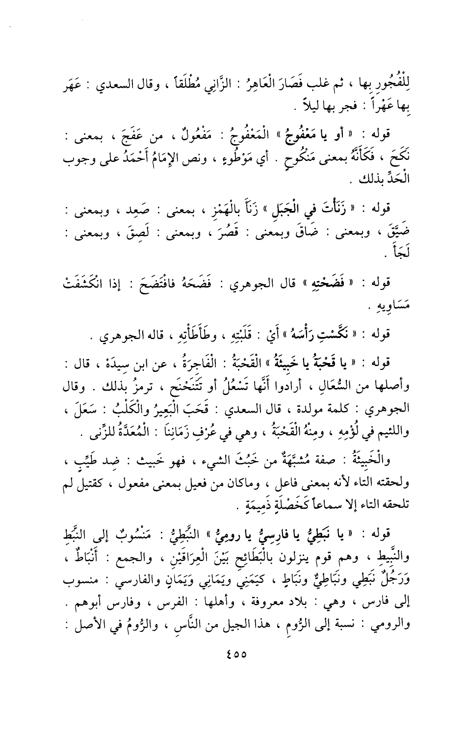 قوله: "يا نَبَطِيُّ يا فارِسِيُّ يا رومِيُّ" النبطي: منسوب إلى النبط والنبيط، وهم قوم ينزلون بالبطائح بين العراقين، والجمع: أنباط، ورجل نبطي ونباطي ونباطٍ، كيمني ويماني ويمانٍ والفارسي: منسوب إلى فارس، وهي: بلاد معروفة، وأهلها: الفرس، وفارس أبوهم. والرومي: نسبة إلى الروم، هذا الجيل من الناس، والروم في الأصل: