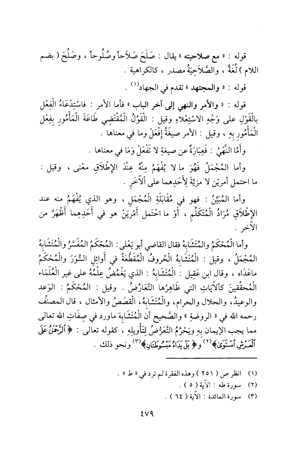 وأما المحكم والمتشابه فقال القاضي أبو يعلى: المحكم المفسر والمتشابه المجمل، وقيل: المتشابه الحروف المقطعة في أوائل السور والمحكم ما عداه، وقال ابن عقيل: المتشابه: الذي يغمض علمه على غير العلماء المحققين كالآيات التي ظاهرها التعارض. وقيل: المحكم: الوعد والوعيد، والحلال والحرام، والمتشابه، القصص والأمثال، قال المصنف رحمه الله في "الروضة" والصحيح أن المتشابه ما ورد في صفات الله تعالى مما يجب الإيمان به ويحرم التعرض لتأويله، كقوله تعالى: {الرَّحْمَنُ عَلَى الْعَرْشِ اسْتَوَى} 2 و {بَلْ يَدَاهُ مَبْسُوطَتَانِ} 3 ونحو ذلك.