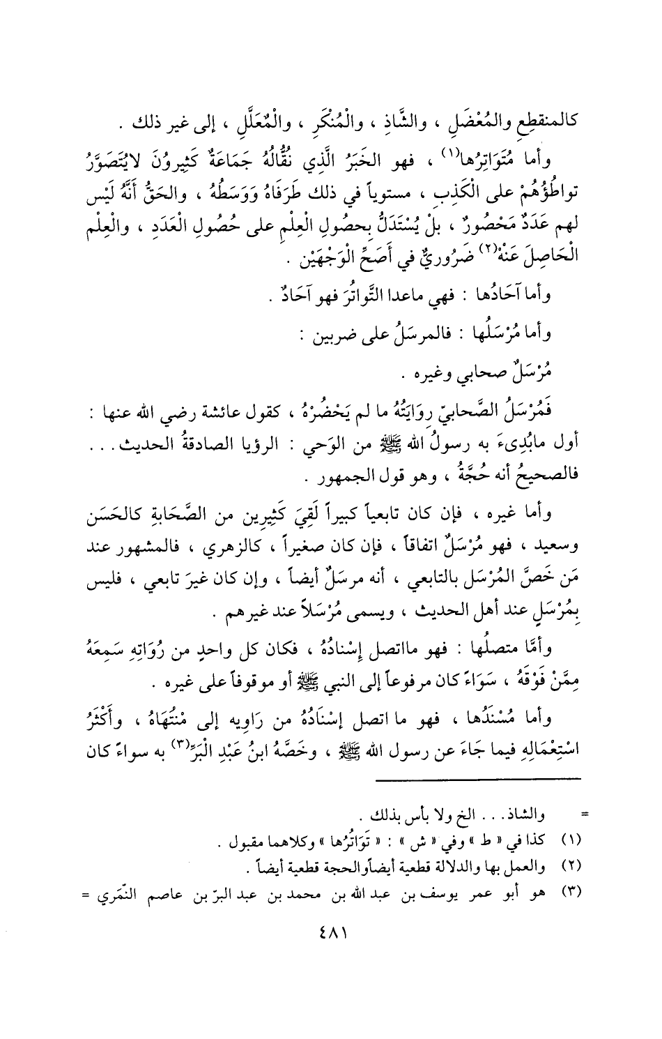 وأما متواترها1، فهو الخبر الذي نقاله جماعة كثيرون لا يتصور تواطؤهم على الكذب، مستويًا في ذلك طرفاة ووسطه، والحق أنه ليس لهم عدد محصور، بل يستدل بحصول العلم على حصول العدد، والعلم الحاصل عنه2 ضروري في أصح الوجهين.