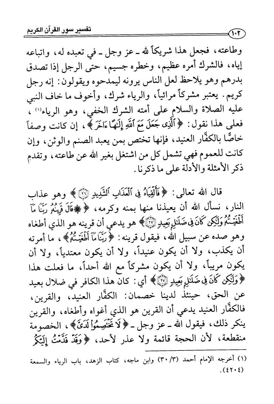 قال الله تعالى: {فألقياه في العذاب الشديد} وهو عذاب النار، نسأل الله أن يعيذنا منها بمنه وكرمه، {قال قرينه ربنا مآ أطغيته ولكن كان في ضلال بعيد} هو يدعي أن قرينه هو الذي أطغاه وهو صده عن سبيل الله، فيقول قرينه: {ربنا مآ أطغيته} ، ما أمرته أن يكذب، ولا أن يكون عنيداً، ولا أن يكون معتدياً، ولا أن يكون مريباً، ولا أن يكون مشركاً مع الله أحداً، ما فعلت هذا {ولكن كان في ضلل بعيد} أي: كان هذا الكافر في ضلال بعيد عن الحق، حينئذ لدينا خصمان: الكفَّار العنيد، والقرين، فالكفَّار العنيد يدعي أن القرين هو الذي أغواه وأطغاه، والقرين ينكر ذلك، فيقول الله - عز وجل - {لا تختصموا لدى} ، الخصومة منقطعة، لأن الحجة قائمة ولا عذر لأحد، {وقد قدمت إليكم