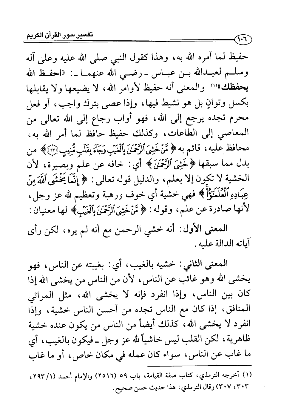 حفيظ لما أمره الله به، وهذا كقول النبي صلى الله عليه وعلى آله وسلم لعبد الله بن عباس - رضي الله عنهما -: «احفظ الله يحفظك» (¬١) والمعنى أنه حفيظ لأوامر الله، لا يضيعها ولا يقابلها بكسل وتوانٍ بل هو نشيط فيها، وإذا عصى بترك واجب، أو فعل محرم تجده يرجع إلى الله، فهو أواب رجاع إلى الله تعالى من المعاصي إلى الطاعات، وكذلك حفيظ حافظ لما أمر الله به، محافظ عليه، قائم به {من خشى الرحمن بالغيب وجاء بقلب منيب} من بدل مما سبقها {خشى الرحمن} أي: خافه عن علم وبصيرة، لأن الخشية لا تكون إلا بعلم، والدليل قوله تعالى: {إنما يخشى الله من عباده العلماء} فهي خشية أي خوف ورهبة وتعظيم لله عز وجل، لأنها صادرة عن علم، وقوله: {من خشى الرحمن بالغيب} لها معنيان: