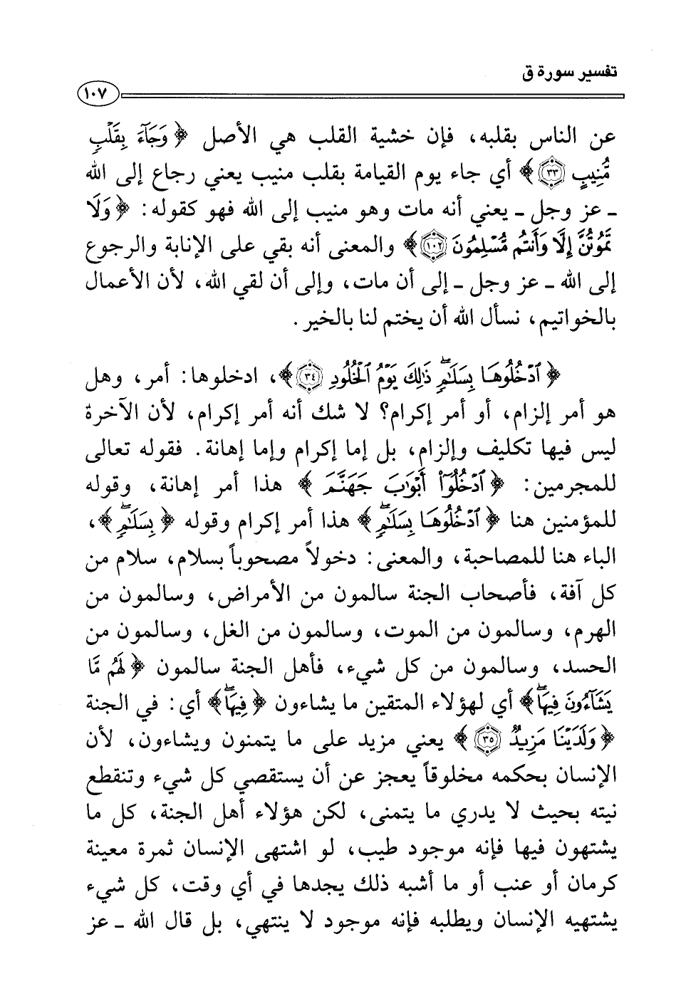 {ادخلوها بسلام ذلك يوم الخلود} ، ادخلوها: أمر، وهل هو أمر إلزام، أو أمر إكرام؟ لا شك أنه أمر إكرام، لأن الآخرة ليس فيها تكليف وإلزام، بل إما إكرام وإما إهانة. فقوله تعالى للمجرمين: {ادخلوا أبوب جهنم} هذا أمر إهانة، وقوله للمؤمنين هنا {ادخلوها بسلام} هذا أمر إكرام وقوله {بسلام} ، الباء هنا للمصاحبة، والمعنى: دخولاً مصحوباً بسلام، سلام من كل آفة، فأصحاب الجنة سالمون من الأمراض، وسالمون من الهرم، وسالمون من الموت، وسالمون من الغل، وسالمون من الحسد، وسالمون من كل شيء، فأهل الجنة سالمون {لهم ما يشاءون فيها} أي لهؤلاء المتقين ما يشاءون {فيها} أي: في الجنة {ولدينا مزيد} يعني مزيد على ما يتمنون ويشاءون، لأن الإنسان بحكمه مخلوقاً يعجز عن أن يستقصي كل شيء وتنقطع نيته بحيث لا يدري ما يتمنى، لكن هؤلاء أهل الجنة، كل ما يشتهون فيها فإنه موجود طيب، لو اشتهى الإنسان ثمرة معينة كرمان أو عنب أو ما أشبه ذلك يجدها في أي وقت، كل شيء يشتهيه الإنسان ويطلبه فإنه موجود لا ينتهي، بل قال الله - عز