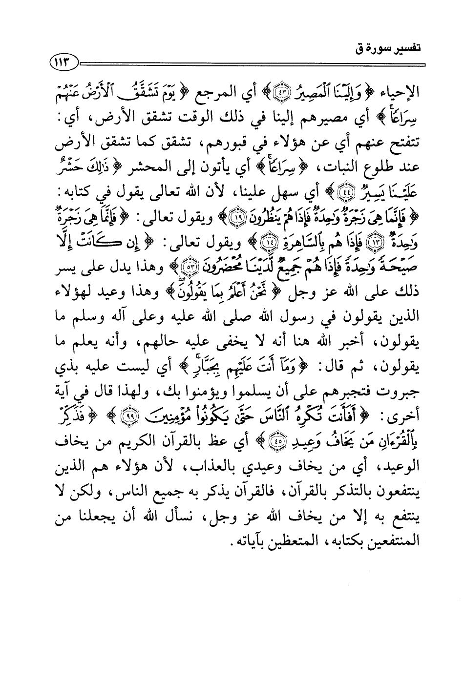 الإحياء {وإلينا المصير} أي المرجع {يوم تشقق الأَرض عنهم سراعاً} أي مصيرهم إلينا في ذلك الوقت تشقق الأرض، أي: تتفتح عنهم أي عن هؤلاء في قبورهم، تشقق كما تشقق الأرض عند طلوع النبات، {سراعاً} أي يأتون إلى المحشر {ذلك حشر علينا يسير} أي سهل علينا، لأن الله تعالى يقول في كتابه: {فإنما هي زجرة واحدة فإذا هم ينظرون} ويقول تعالى: {فإنما هي زجرة واحدة فإذا هم بالساهرة} ويقول تعالى: {إن كانت إلا صيحةً واحدة فإذا هم جميع لدينا محضرون} وهذا يدل على يسر ذلك على الله عز وجل {نحن أعلم بما يقولون} وهذا وعيد لهؤلاء الذين يقولون في رسول الله صلى الله عليه وعلى آله وسلم ما يقولون، أخبر الله هنا أنه لا يخفى عليه حالهم، وأنه يعلم ما يقولون، ثم قال: {ومآ أنت عليهم بجبار} أي ليست عليه بذي جبروت فتجبرهم على أن يسلموا ويؤمنوا بك، ولهذا قال في آية أخرى: {أفأنت تكره الناس حتى يكونوا مؤمنين} {فذكر بالقرءان من يخاف وعيد} أي عظ بالقرآن الكريم من يخاف الوعيد، أي من يخاف وعيدي بالعذاب، لأن هؤلاء هم الذين ينتفعون بالتذكر بالقرآن، فالقرآن يذكر به جميع الناس، ولكن لا ينتفع به إلا من يخاف الله عز وجل، نسأل الله أن يجعلنا من المنتفعين بكتابه، المتعظين بآياته.