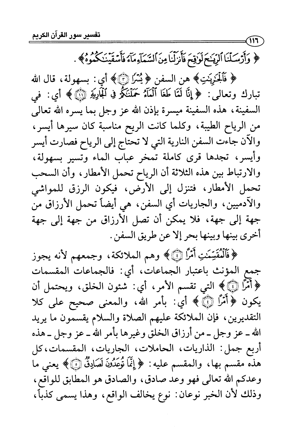 {فالمقسمات أمراً} وهم الملائكة، وجمعهم لأنه يجوز جمع المؤنث باعتبار الجماعات، أي: فالجماعات المقسمات {أمراً} التي تقسم الأمر، أي: شئون الخلق، ويحتمل أن يكون {أمراً} أي: بأمر الله، والمعنى صحيح على كلا التقديرين، فإن الملائكة عليهم الصلاة والسلام يقسمون ما يريد الله - عز وجل - من أرزاق الخلق وغيرها بأمر الله - عز وجل - هذه أربع جمل: الذاريات، الحاملات، الجاريات، المقسمات، كل هذه مقسم بها، والمقسم عليه: {إنما توعدون لصادق} يعني ما وعدكم الله تعالى فهو وعد صادق، والصادق هو المطابق للواقع، وذلك لأن الخبر نوعان: نوع يخالف الواقع، وهذا يسمى كذباً،